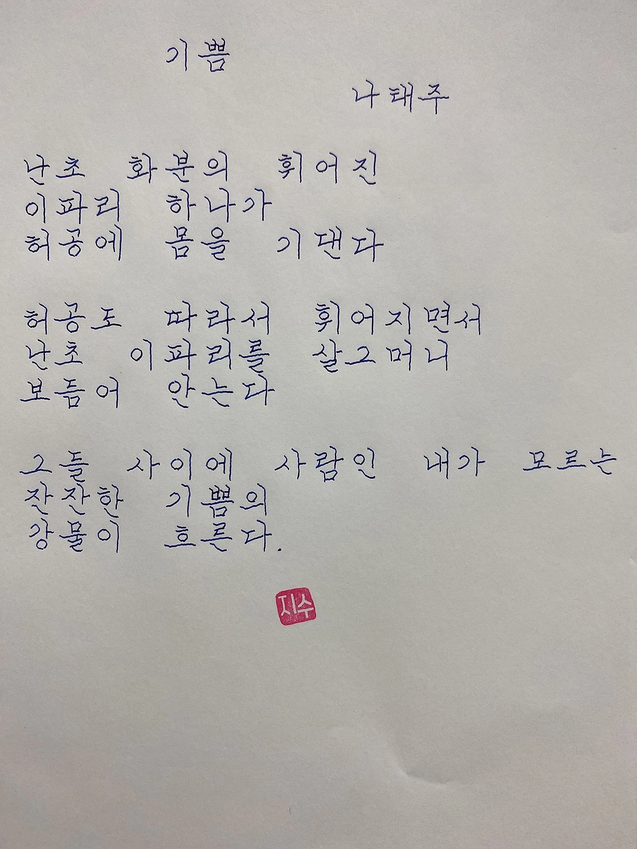 평범한 직장인. 사내 동호회를 통해 매일 한편 손으로 시 읽기를 시작한 이후로, 매일 시 한편을 필사 합니다. 필사한 시가 저작권에 문제가 된다면 말씀해주세요.