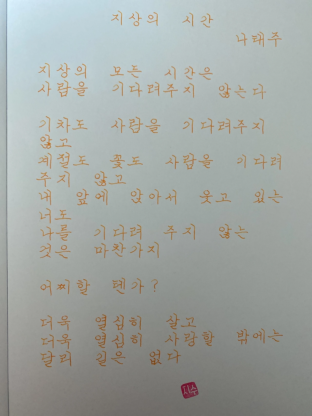 평범한 직장인. 사내 동호회를 통해 매일 한편 손으로 시 읽기를 시작한 이후로, 매일 시 한편을 필사 합니다. 필사한 시가 저작권에 문제가 된다면 말씀해주세요.