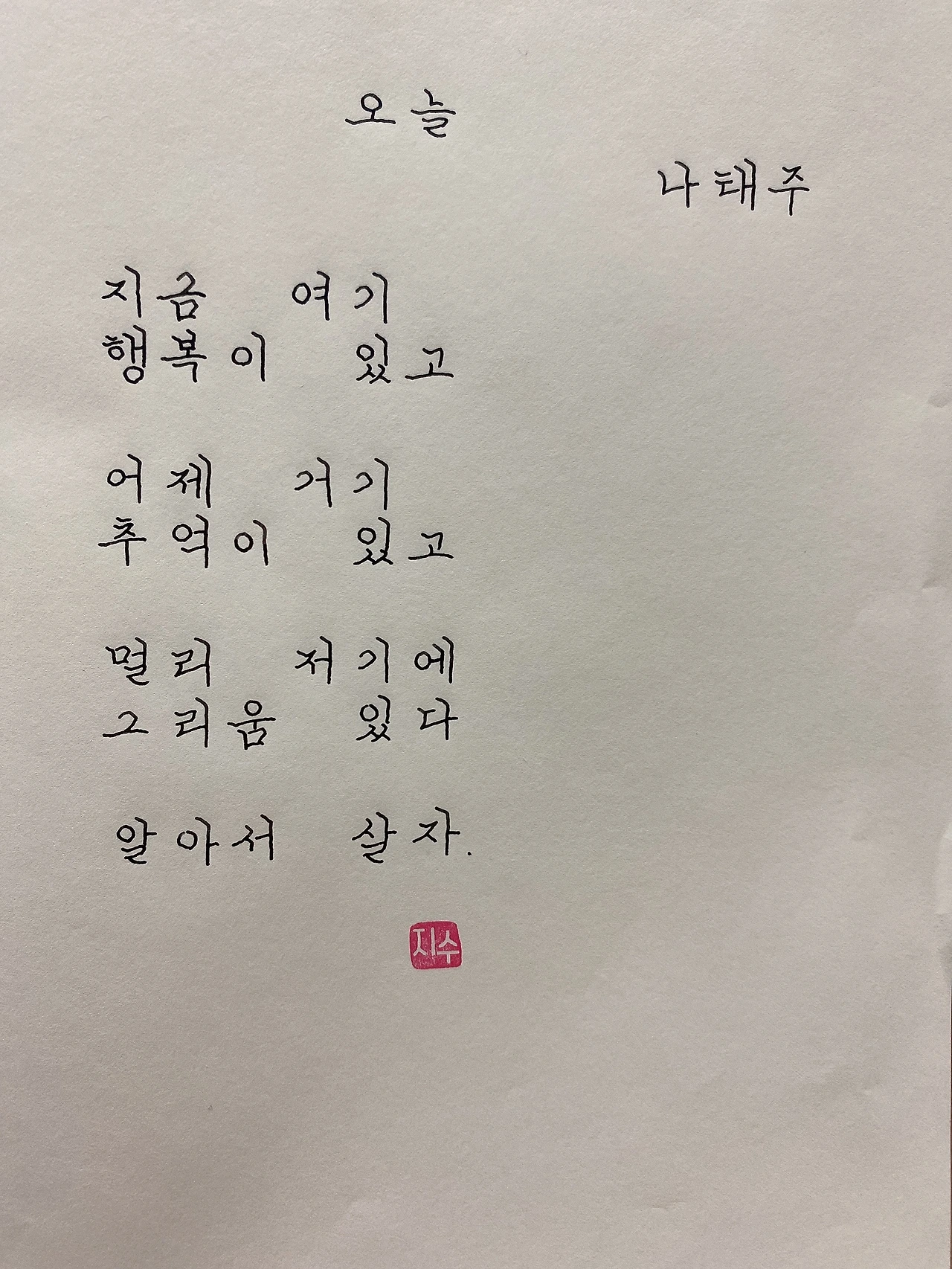 평범한 직장인. 사내 동호회를 통해 매일 한편 손으로 시 읽기를 시작한 이후로, 매일 시 한편을 필사 합니다. 필사한 시가 저작권에 문제가 된다면 말씀해주세요.