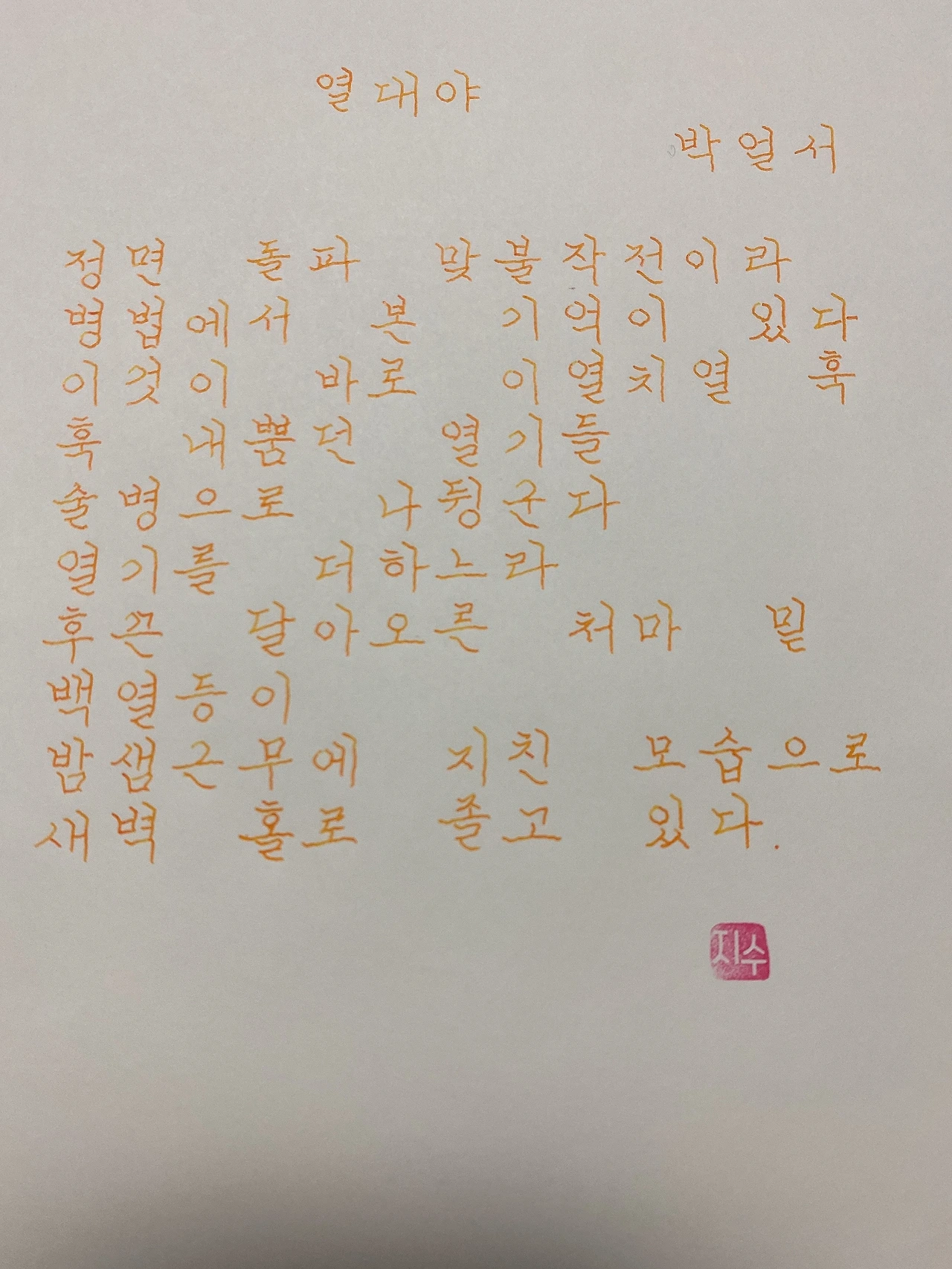 평범한 직장인. 사내 동호회를 통해 매일 한편 손으로 시 읽기를 시작한 이후로, 매일 시 한편을 필사 합니다. 필사한 시가 저작권에 문제가 된다면 말씀해주세요.