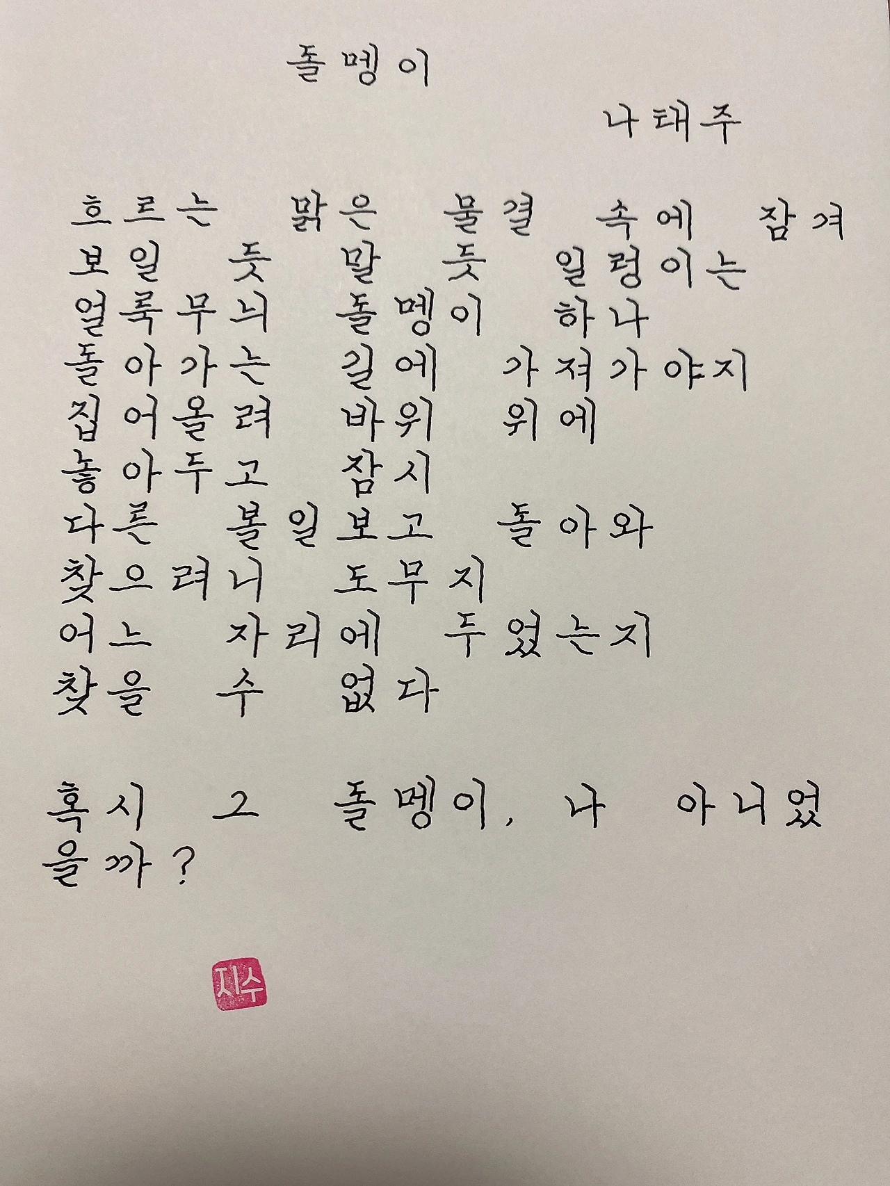 평범한 직장인. 사내 동호회를 통해 매일 한편 손으로 시 읽기를 시작한 이후로, 매일 시 한편을 필사 합니다. 필사한 시가 저작권에 문제가 된다면 말씀해주세요.