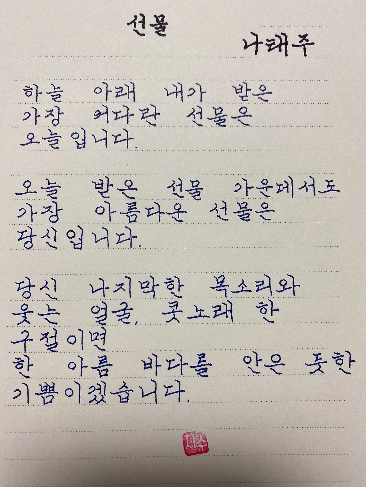 평범한 직장인. 사내 동호회를 통해 매일 한편 손으로 시 읽기를 시작한 이후로, 매일 시 한편을 필사 합니다. 필사한 시가 저작권에 문제가 된다면 말씀해주세요.