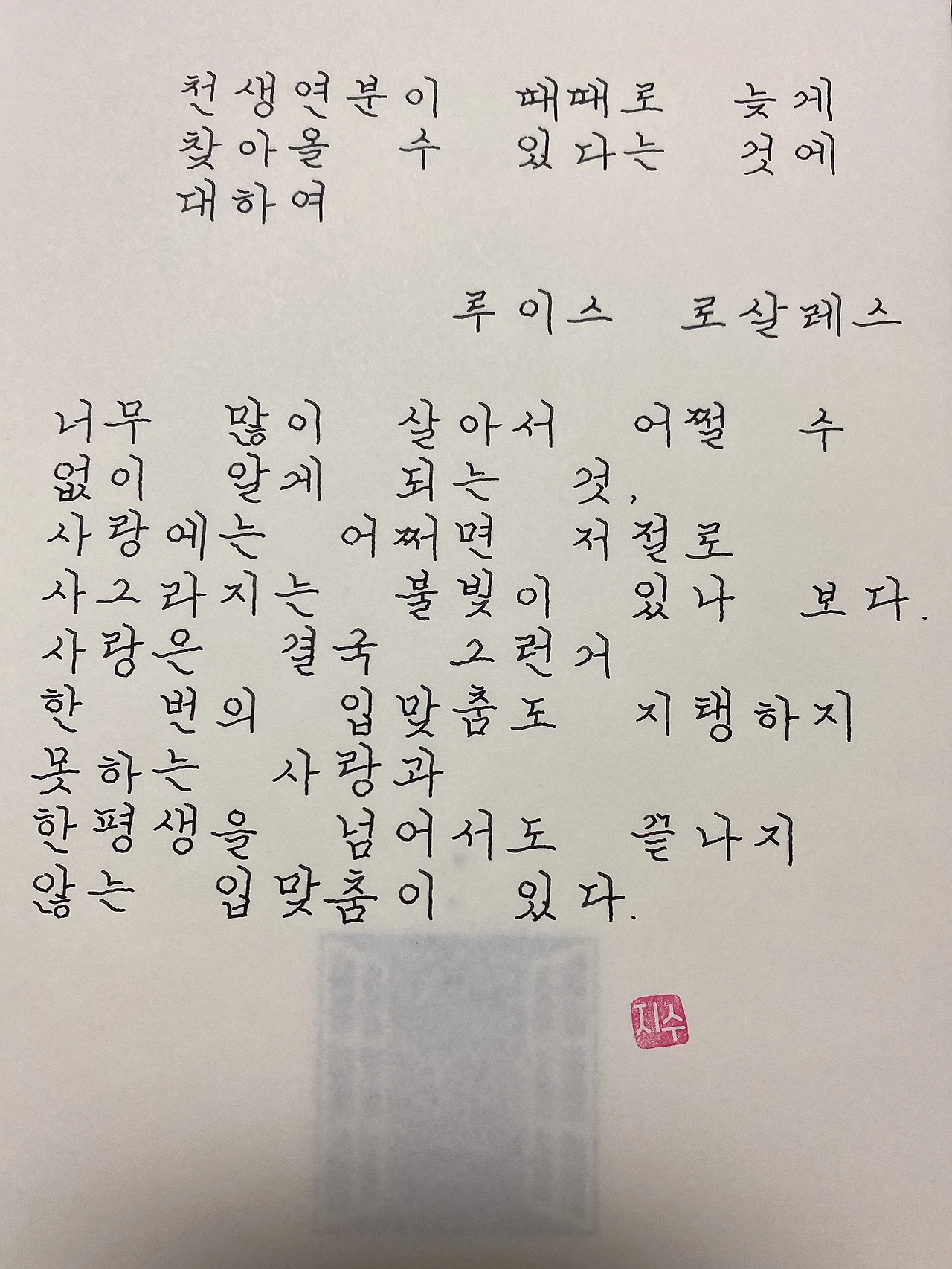 평범한 직장인. 사내 동호회를 통해 매일 한편 손으로 시 읽기를 시작한 이후로, 매일 시 한편을 필사 합니다. 필사한 시가 저작권에 문제가 된다면 말씀해주세요.