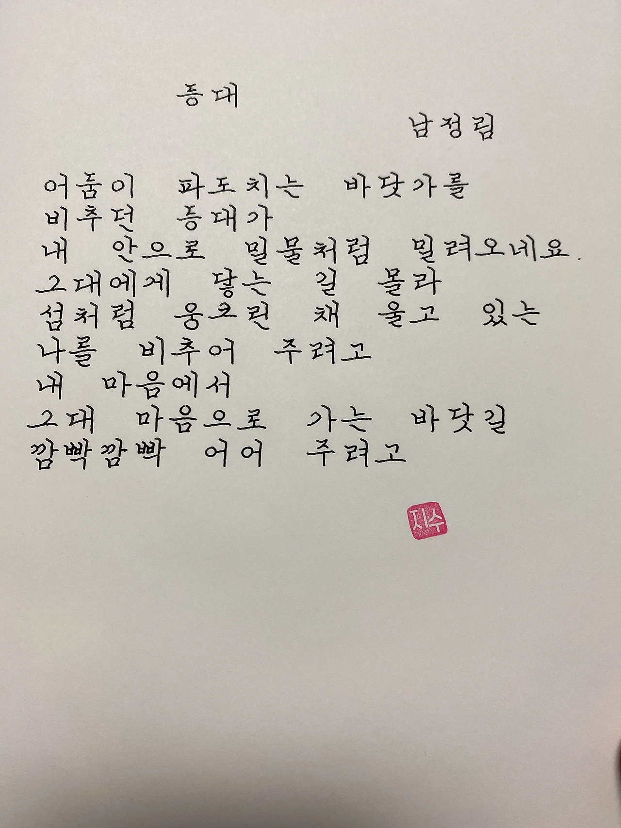 평범한 직장인. 사내 동호회를 통해 매일 한편 손으로 시 읽기를 시작한 이후로, 매일 시 한편을 필사 합니다. 필사한 시가 저작권에 문제가 된다면 말씀해주세요.