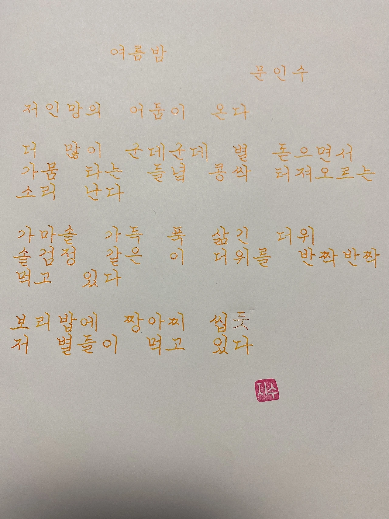 평범한 직장인. 사내 동호회를 통해 매일 한편 손으로 시 읽기를 시작한 이후로, 매일 시 한편을 필사 합니다. 필사한 시가 저작권에 문제가 된다면 말씀해주세요.