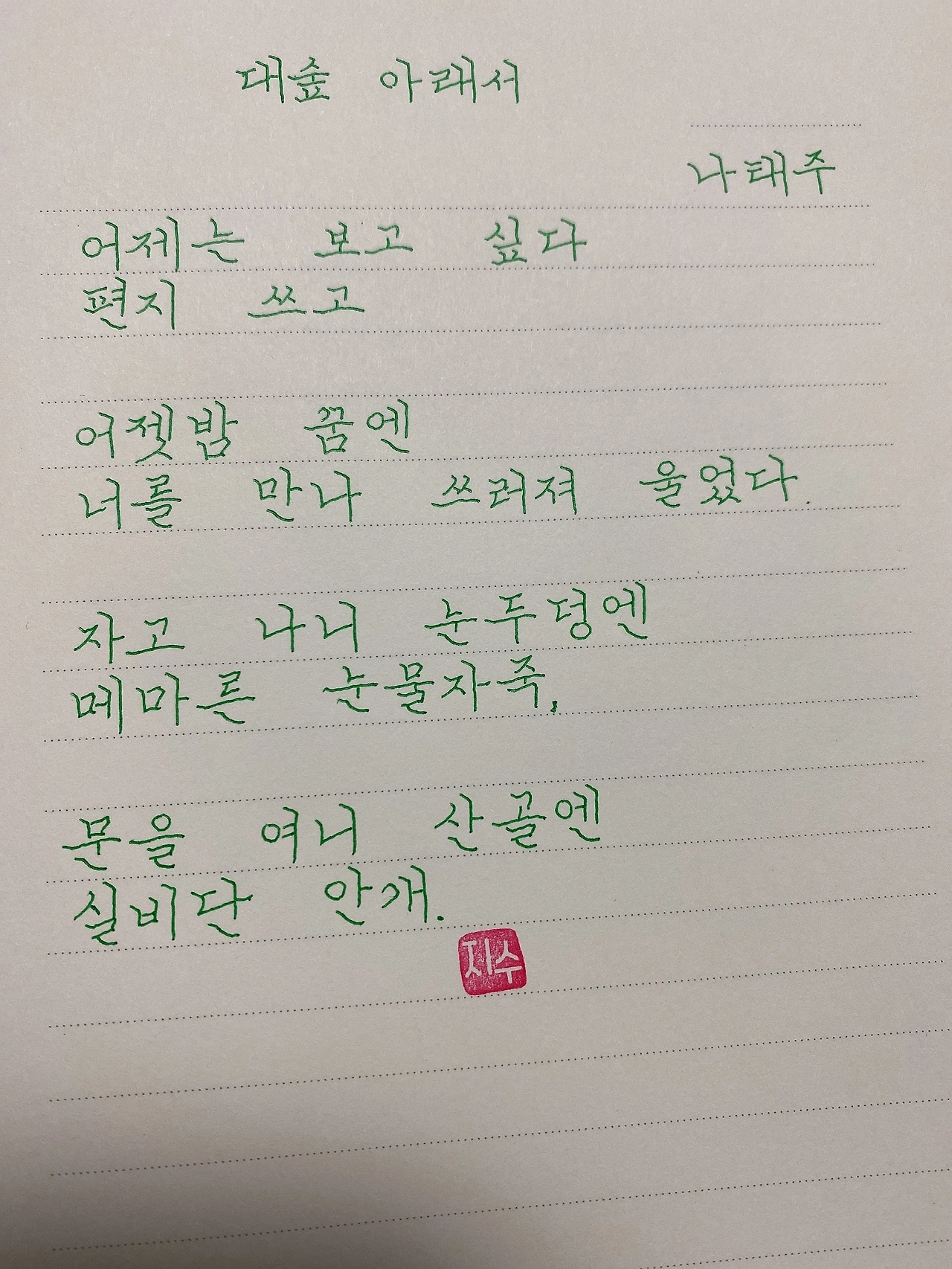 평범한 직장인. 사내 동호회를 통해 매일 한편 손으로 시 읽기를 시작한 이후로, 매일 시 한편을 필사 합니다. 필사한 시가 저작권에 문제가 된다면 말씀해주세요.