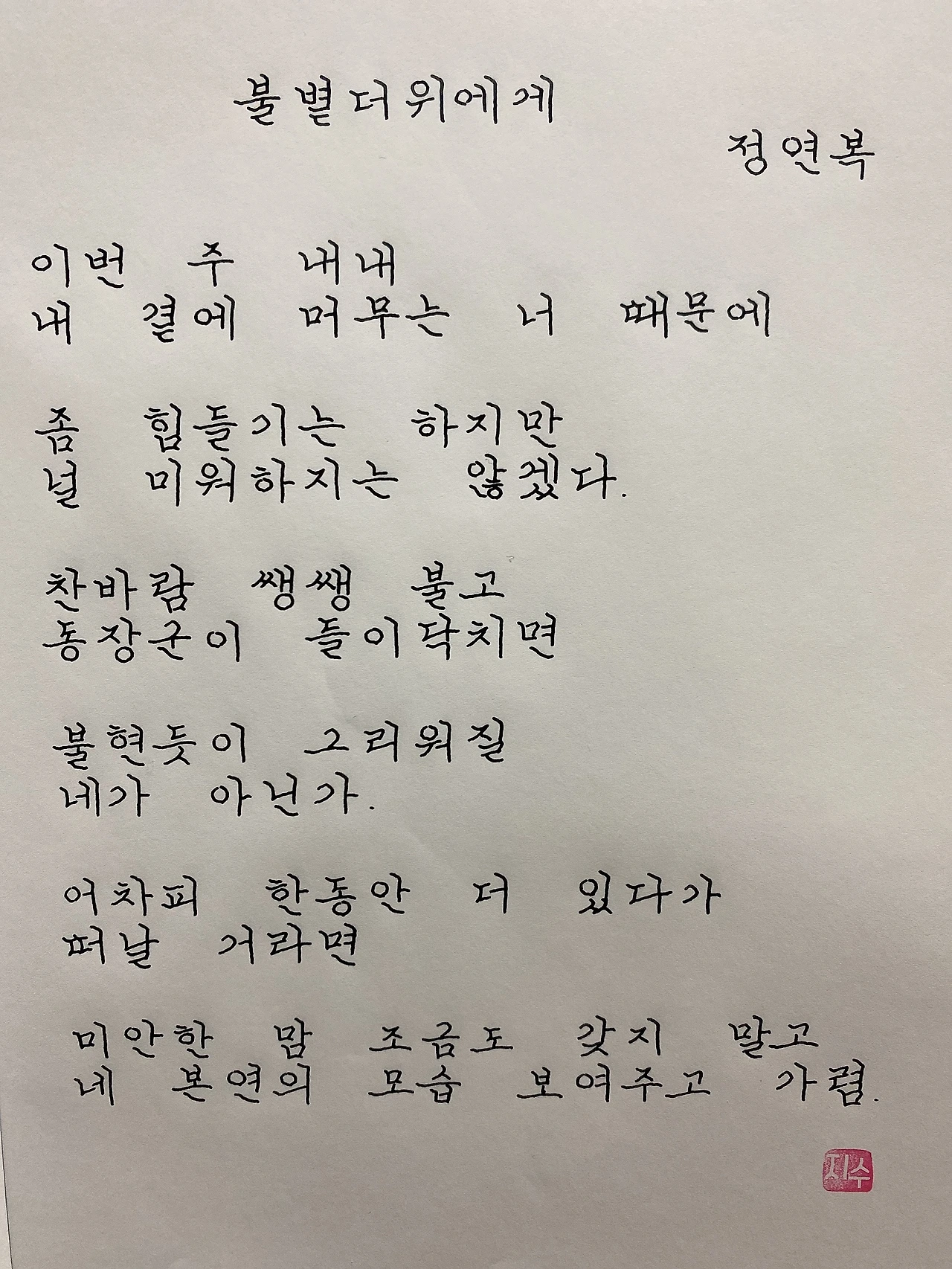 평범한 직장인. 사내 동호회를 통해 매일 한편 손으로 시 읽기를 시작한 이후로, 매일 시 한편을 필사 합니다. 필사한 시가 저작권에 문제가 된다면 말씀해주세요.