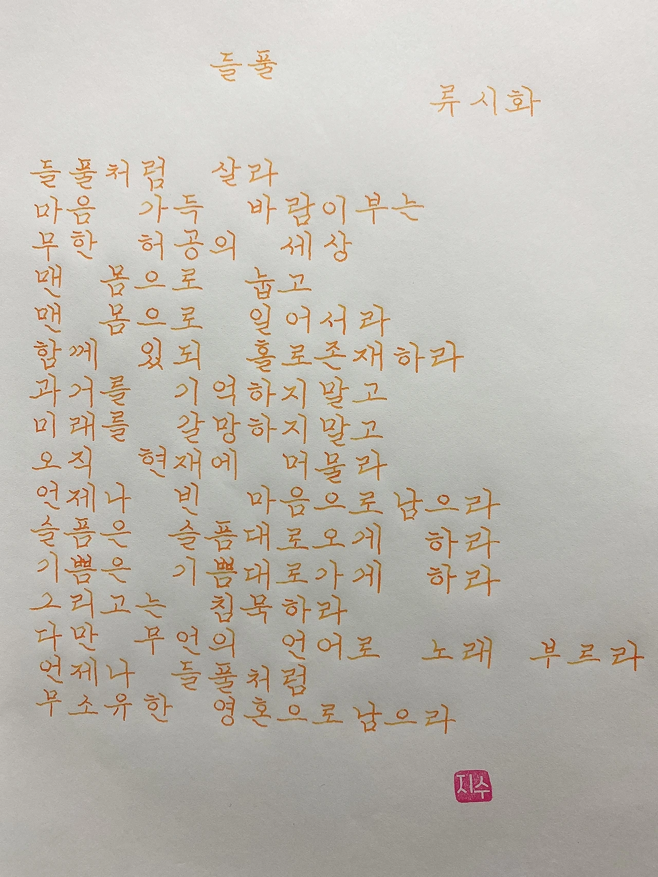 평범한 직장인. 사내 동호회를 통해 매일 한편 손으로 시 읽기를 시작한 이후로, 매일 시 한편을 필사 합니다. 필사한 시가 저작권에 문제가 된다면 말씀해주세요.