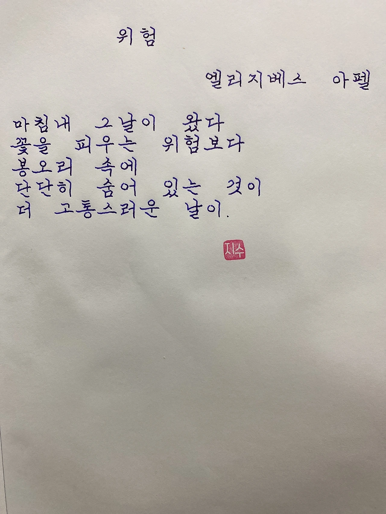 평범한 직장인. 사내 동호회를 통해 매일 한편 손으로 시 읽기를 시작한 이후로, 매일 시 한편을 필사 합니다. 필사한 시가 저작권에 문제가 된다면 말씀해주세요.