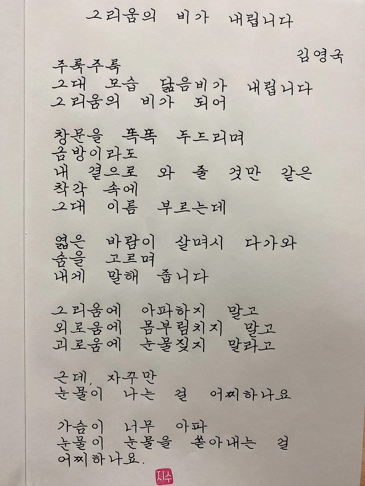 평범한 직장인. 사내 동호회를 통해 매일 한편 손으로 시 읽기를 시작한 이후로, 매일 시 한편을 필사 합니다. 필사한 시가 저작권에 문제가 된다면 말씀해주세요.