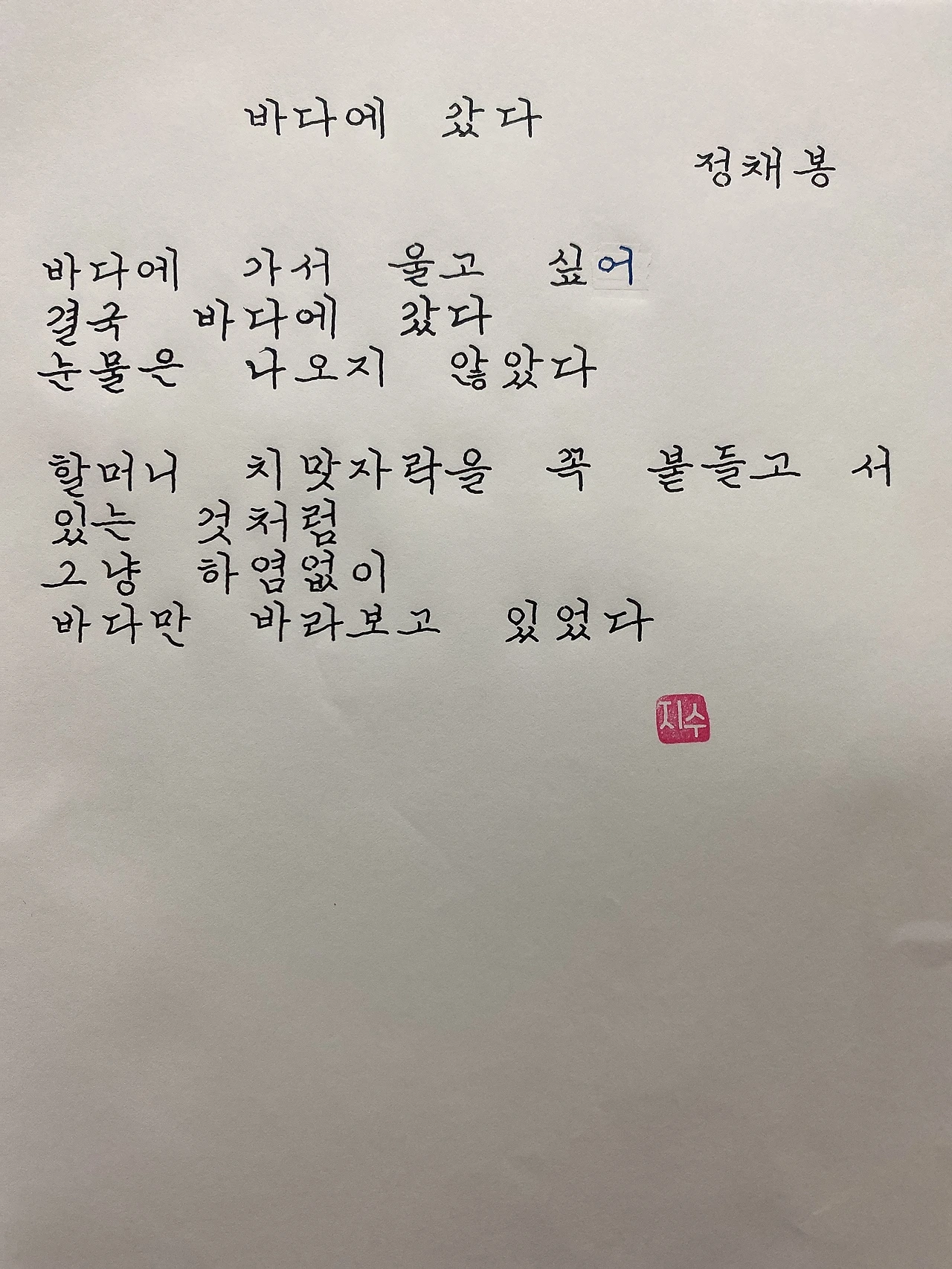 평범한 직장인. 사내 동호회를 통해 매일 한편 손으로 시 읽기를 시작한 이후로, 매일 시 한편을 필사 합니다. 필사한 시가 저작권에 문제가 된다면 말씀해주세요.