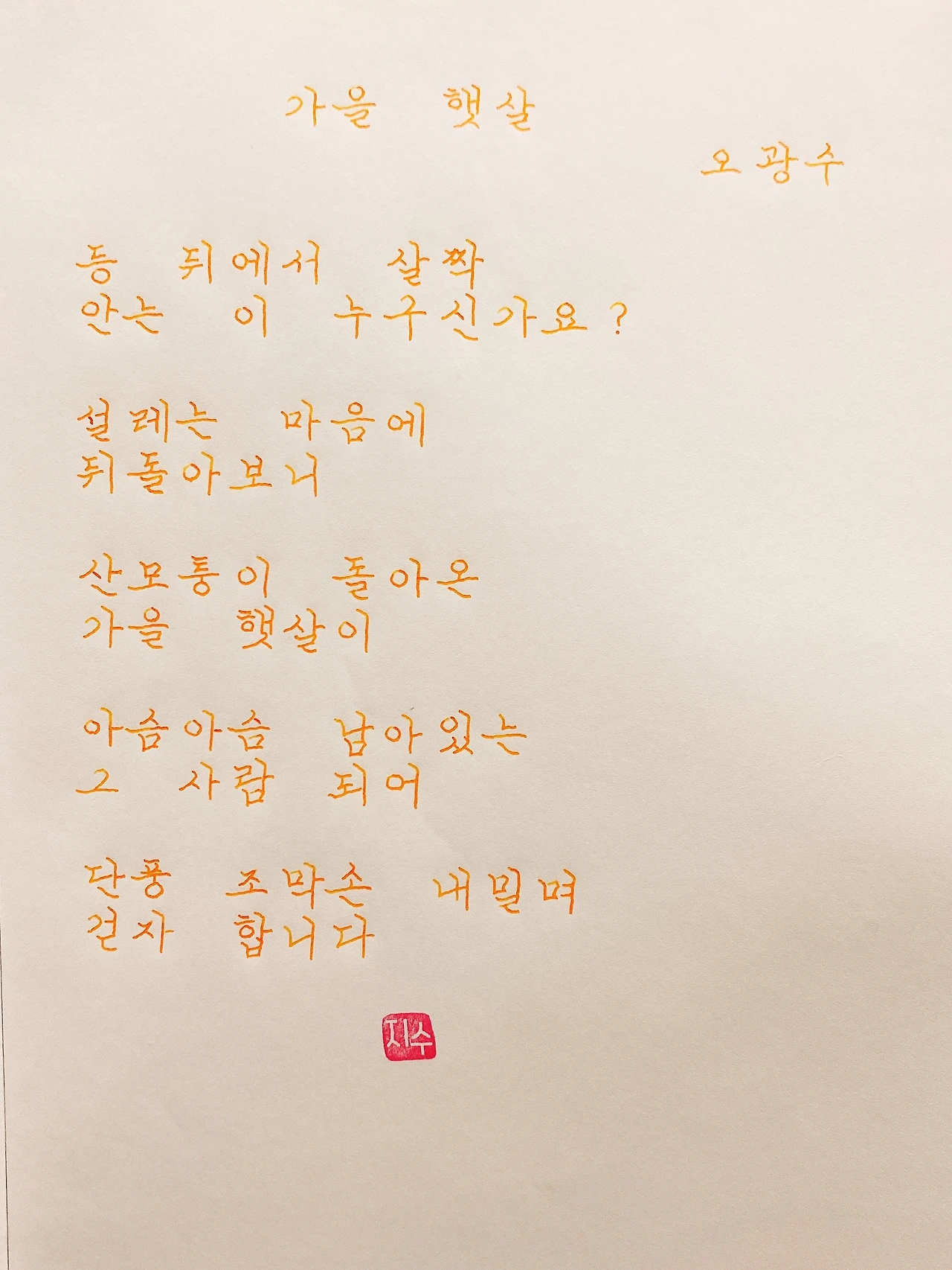 평범한 직장인. 사내 동호회를 통해 매일 한편 손으로 시 읽기를 시작한 이후로, 매일 시 한편을 필사 합니다. 필사한 시가 저작권에 문제가 된다면 말씀해주세요.