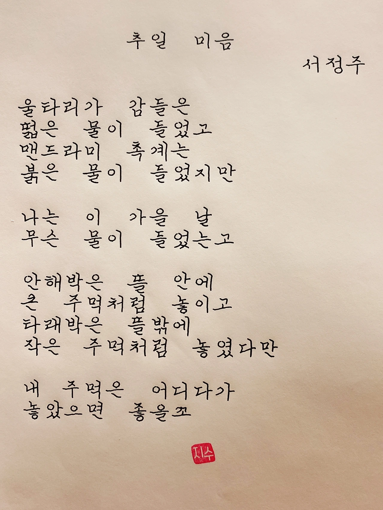평범한 직장인. 사내 동호회를 통해 매일 한편 손으로 시 읽기를 시작한 이후로, 매일 시 한편을 필사 합니다. 필사한 시가 저작권에 문제가 된다면 말씀해주세요.