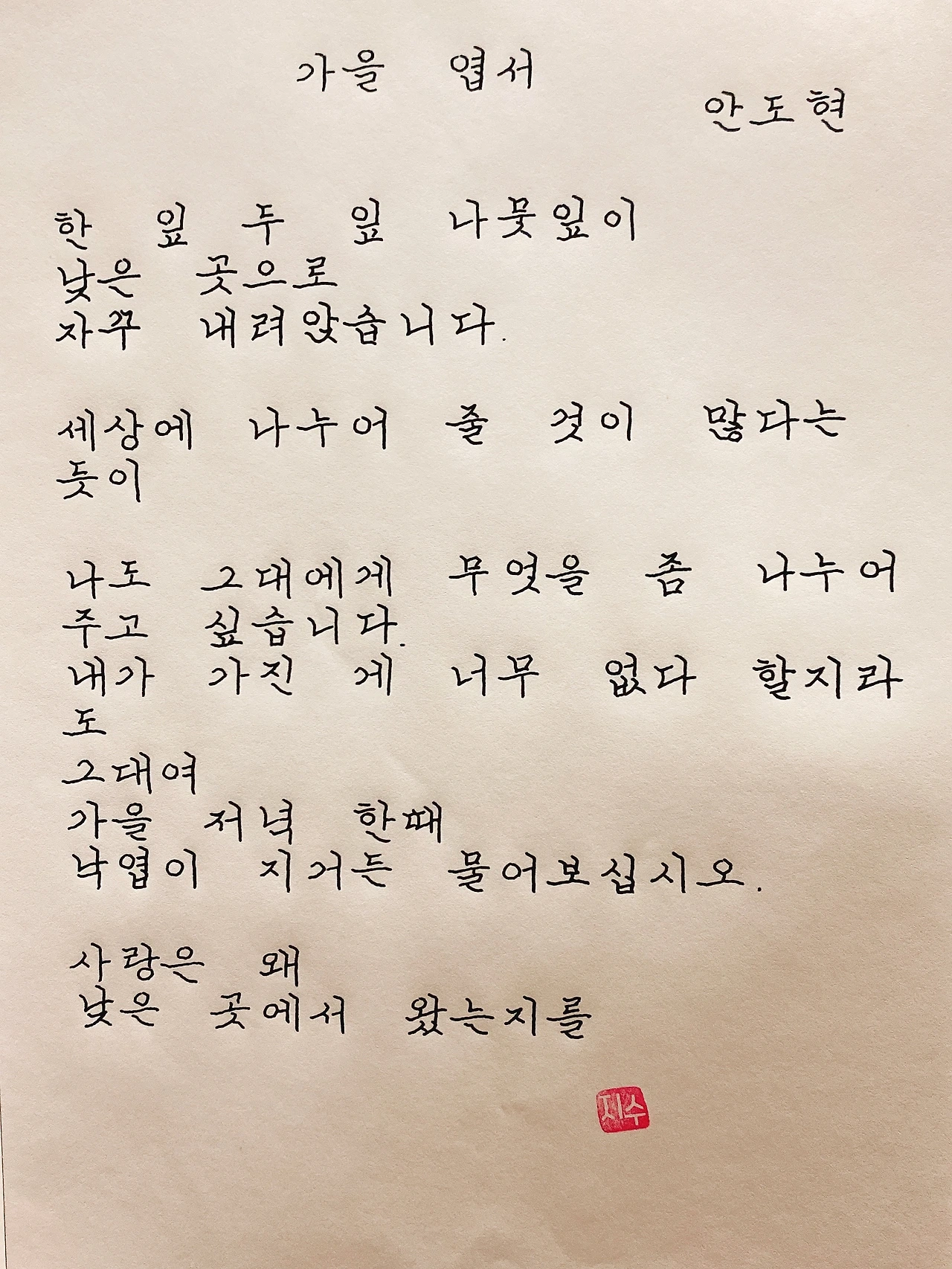 평범한 직장인. 사내 동호회를 통해 매일 한편 손으로 시 읽기를 시작한 이후로, 매일 시 한편을 필사 합니다. 필사한 시가 저작권에 문제가 된다면 말씀해주세요.