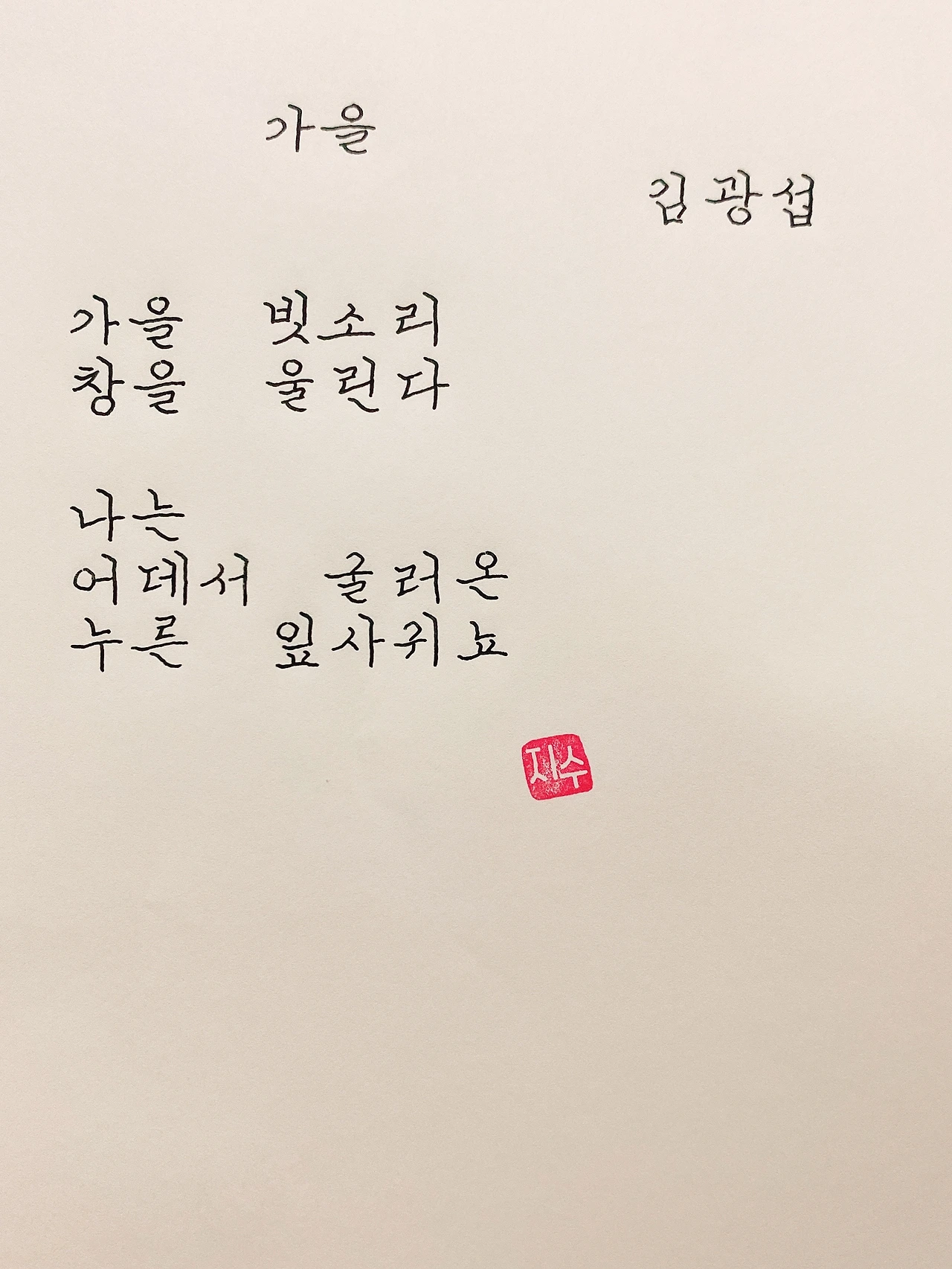 평범한 직장인. 사내 동호회를 통해 매일 한편 손으로 시 읽기를 시작한 이후로, 매일 시 한편을 필사 합니다. 필사한 시가 저작권에 문제가 된다면 말씀해주세요.
