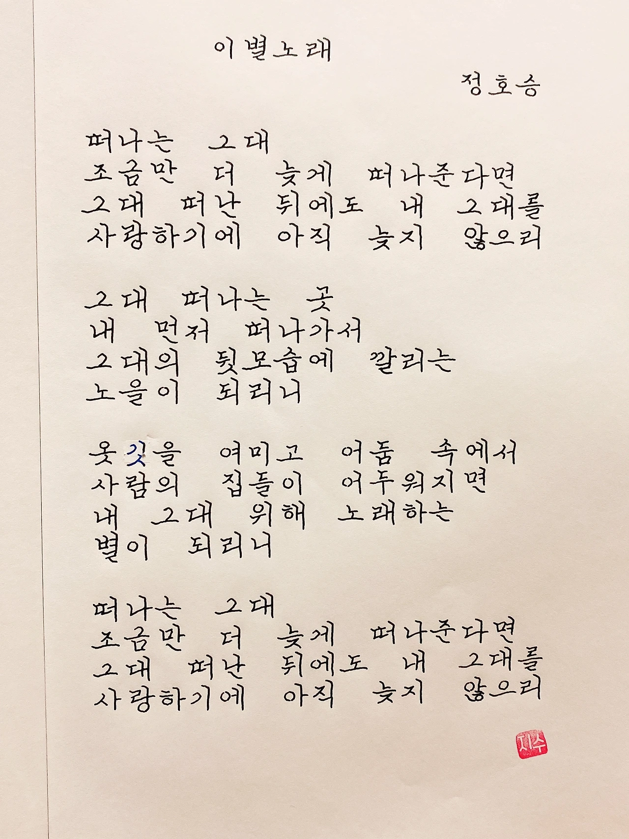 평범한 직장인. 사내 동호회를 통해 매일 한편 손으로 시 읽기를 시작한 이후로, 매일 시 한편을 필사 합니다. 필사한 시가 저작권에 문제가 된다면 말씀해주세요.