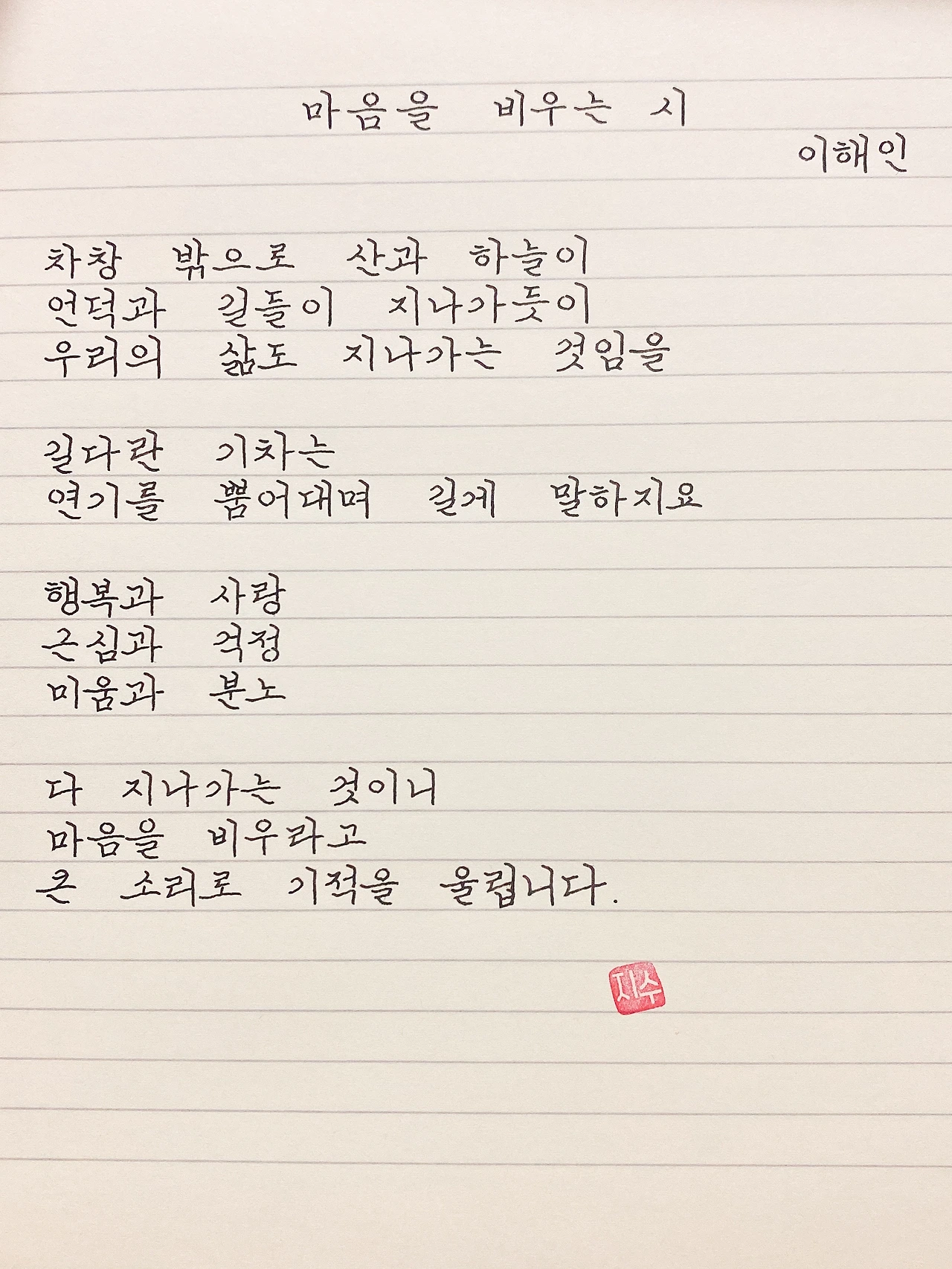 평범한 직장인. 사내 동호회를 통해 매일 한편 손으로 시 읽기를 시작한 이후로, 매일 시 한편을 필사 합니다. 필사한 시가 저작권에 문제가 된다면 말씀해주세요.