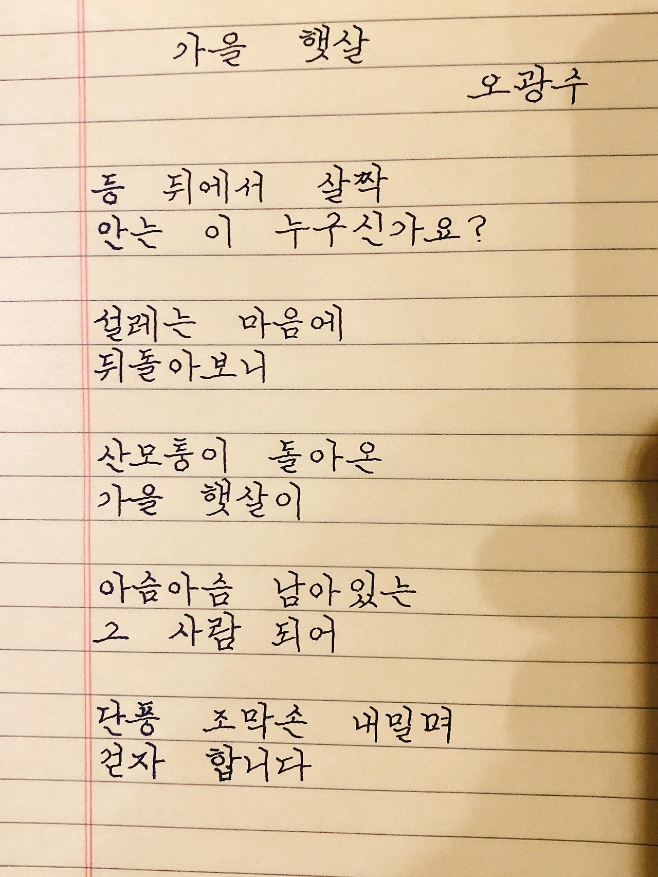 평범한 직장인. 사내 동호회를 통해 매일 한편 손으로 시 읽기를 시작한 이후로, 매일 시 한편을 필사 합니다. 필사한 시가 저작권에 문제가 된다면 말씀해주세요.