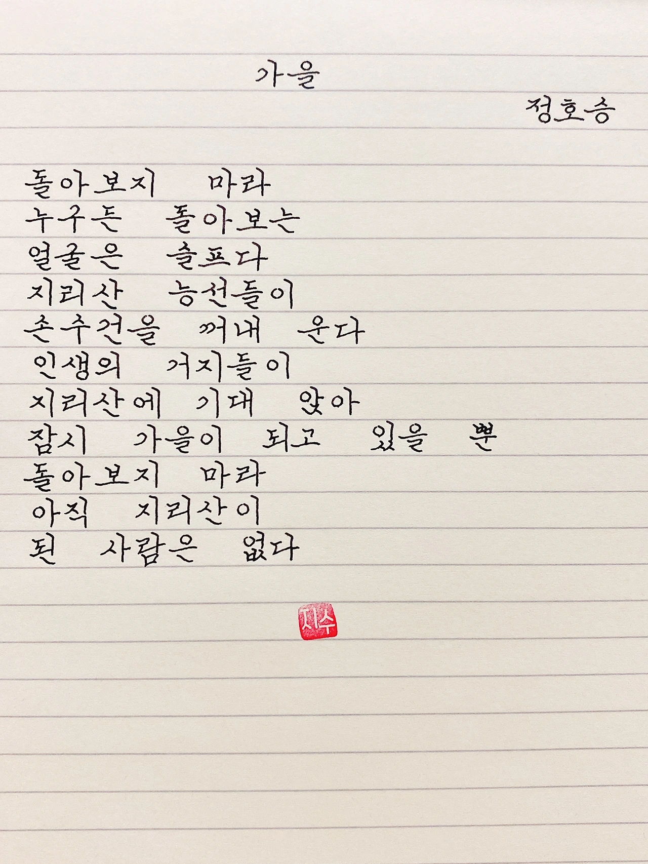 평범한 직장인. 사내 동호회를 통해 매일 한편 손으로 시 읽기를 시작한 이후로, 매일 시 한편을 필사 합니다. 필사한 시가 저작권에 문제가 된다면 말씀해주세요.