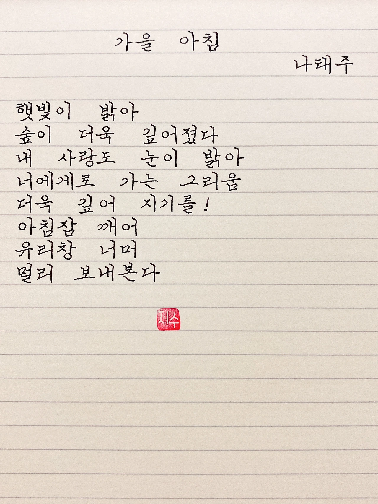 평범한 직장인. 사내 동호회를 통해 매일 한편 손으로 시 읽기를 시작한 이후로, 매일 시 한편을 필사 합니다. 필사한 시가 저작권에 문제가 된다면 말씀해주세요.