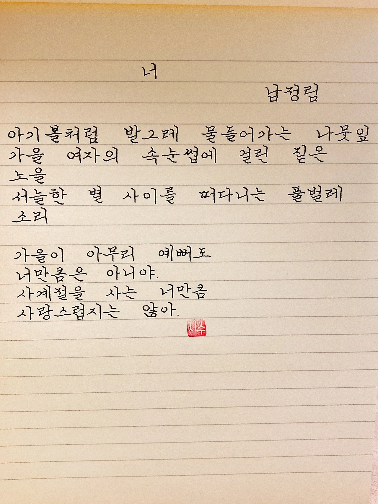 평범한 직장인. 사내 동호회를 통해 매일 한편 손으로 시 읽기를 시작한 이후로, 매일 시 한편을 필사 합니다. 필사한 시가 저작권에 문제가 된다면 말씀해주세요.