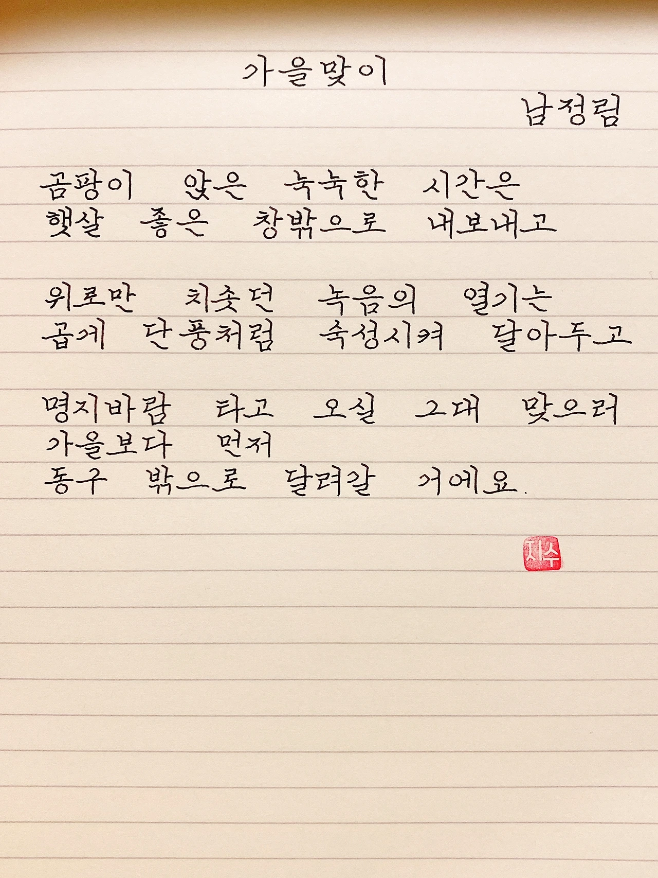 평범한 직장인. 사내 동호회를 통해 매일 한편 손으로 시 읽기를 시작한 이후로, 매일 시 한편을 필사 합니다. 필사한 시가 저작권에 문제가 된다면 말씀해주세요.