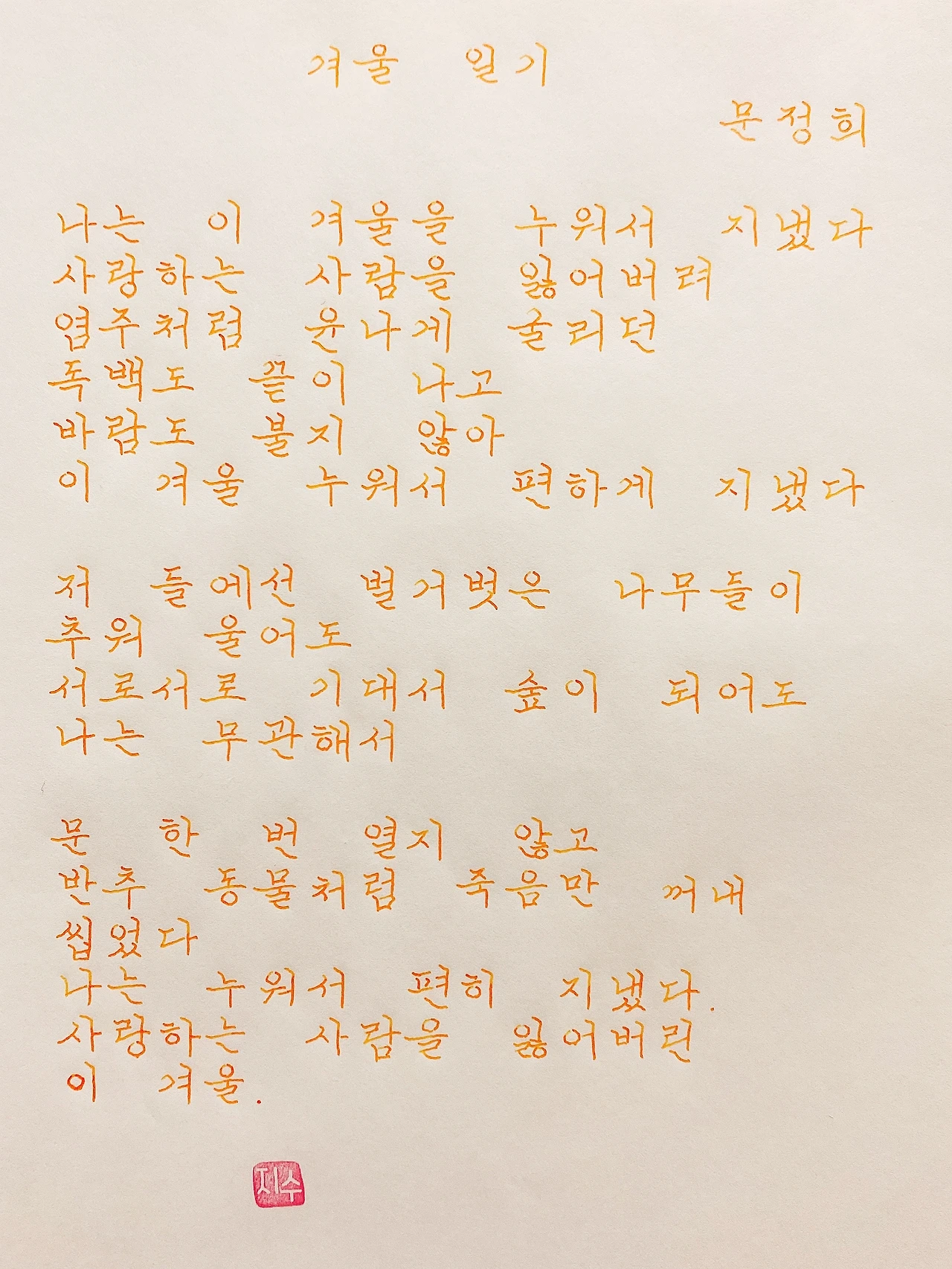 평범한 직장인. 사내 동호회를 통해 매일 한편 손으로 시 읽기를 시작한 이후로, 매일 시 한편을 필사 합니다. 필사한 시가 저작권에 문제가 된다면 말씀해주세요.