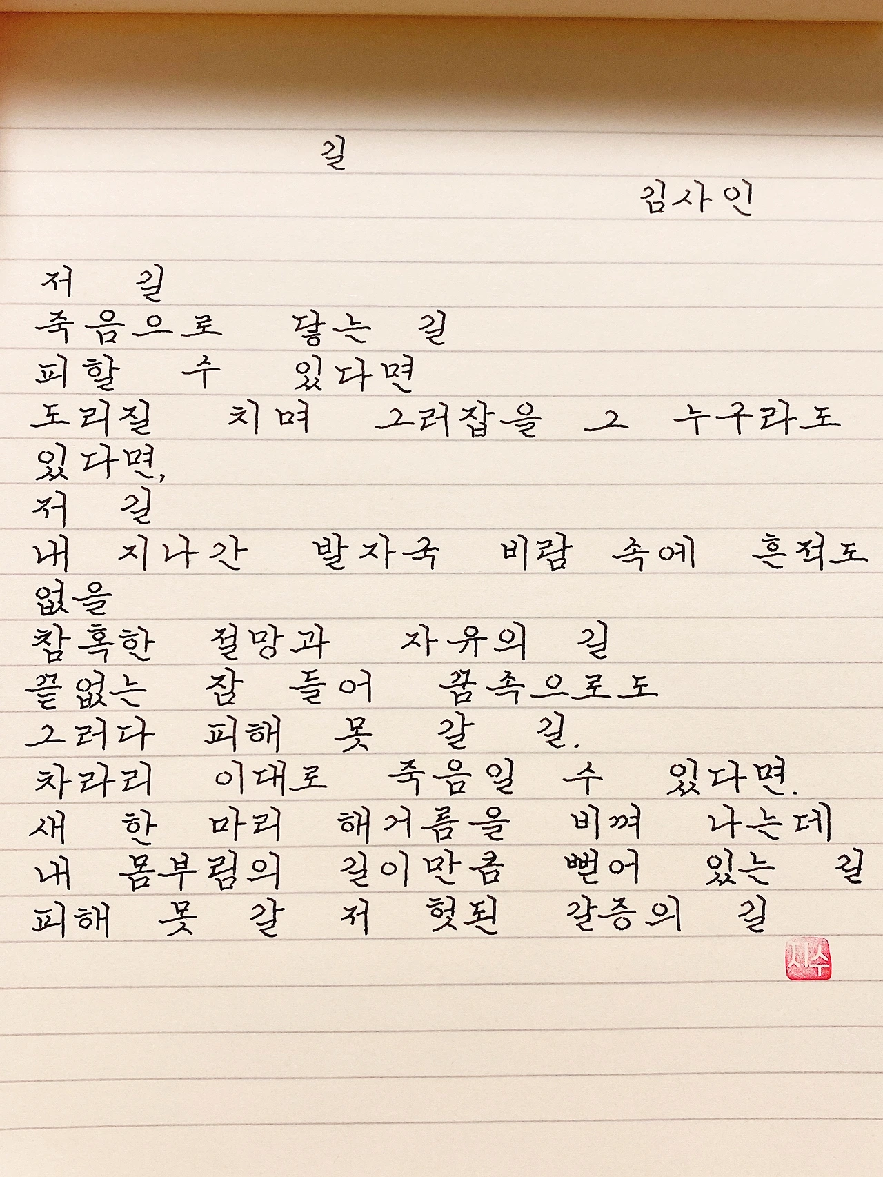 평범한 직장인. 사내 동호회를 통해 매일 한편 손으로 시 읽기를 시작한 이후로, 매일 시 한편을 필사 합니다. 필사한 시가 저작권에 문제가 된다면 말씀해주세요.
