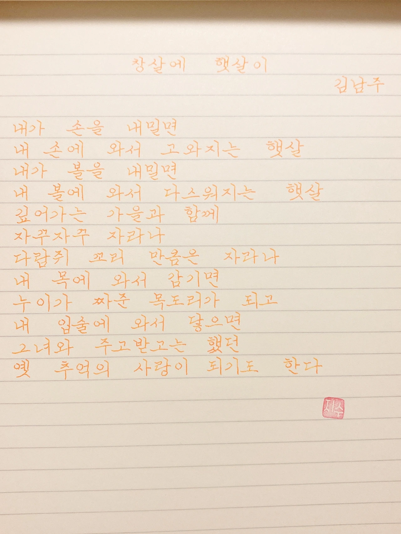평범한 직장인. 사내 동호회를 통해 매일 한편 손으로 시 읽기를 시작한 이후로, 매일 시 한편을 필사 합니다. 필사한 시가 저작권에 문제가 된다면 말씀해주세요.