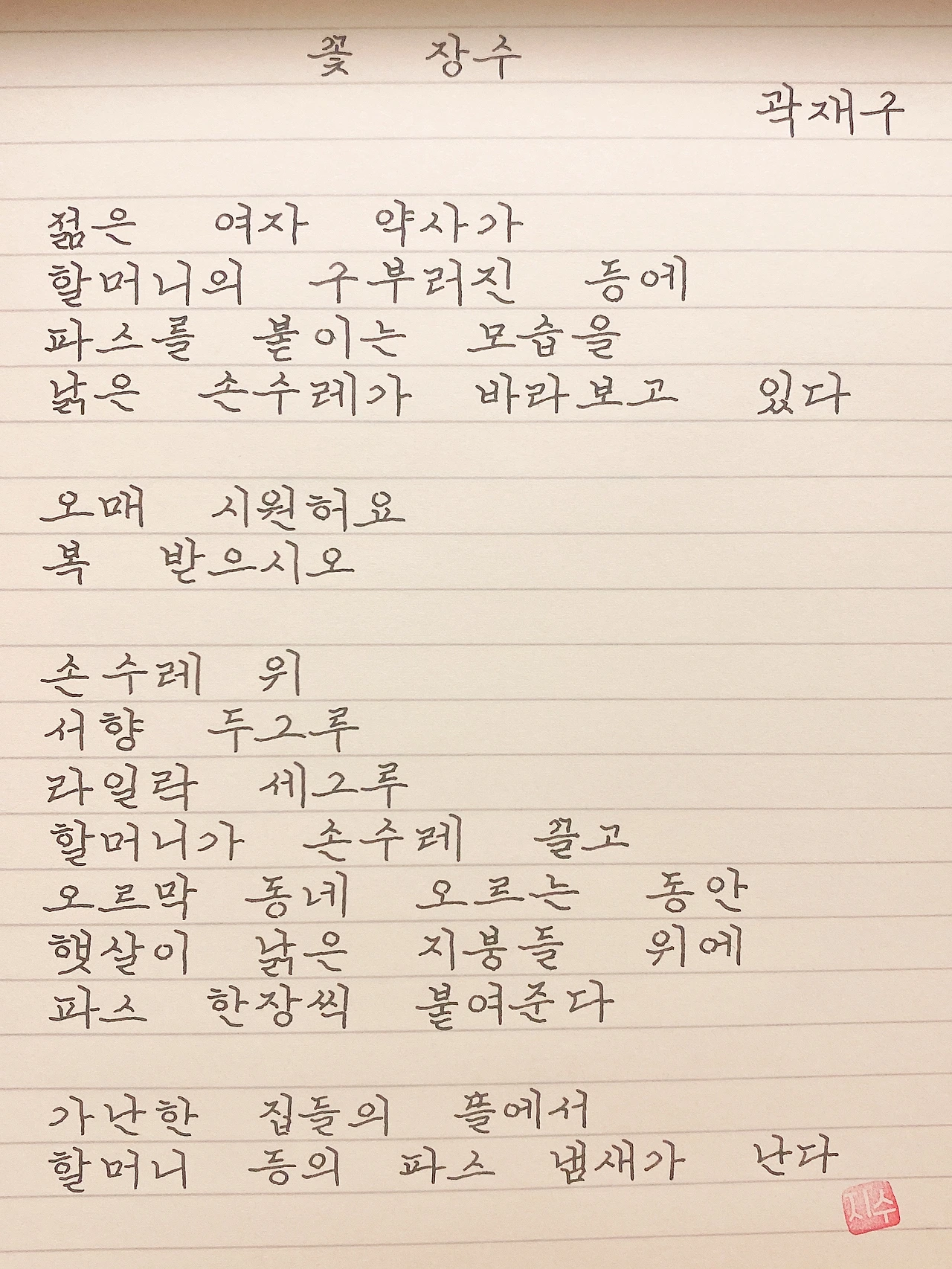 평범한 직장인. 사내 동호회를 통해 매일 한편 손으로 시 읽기를 시작한 이후로, 매일 시 한편을 필사 합니다. 필사한 시가 저작권에 문제가 된다면 말씀해주세요.