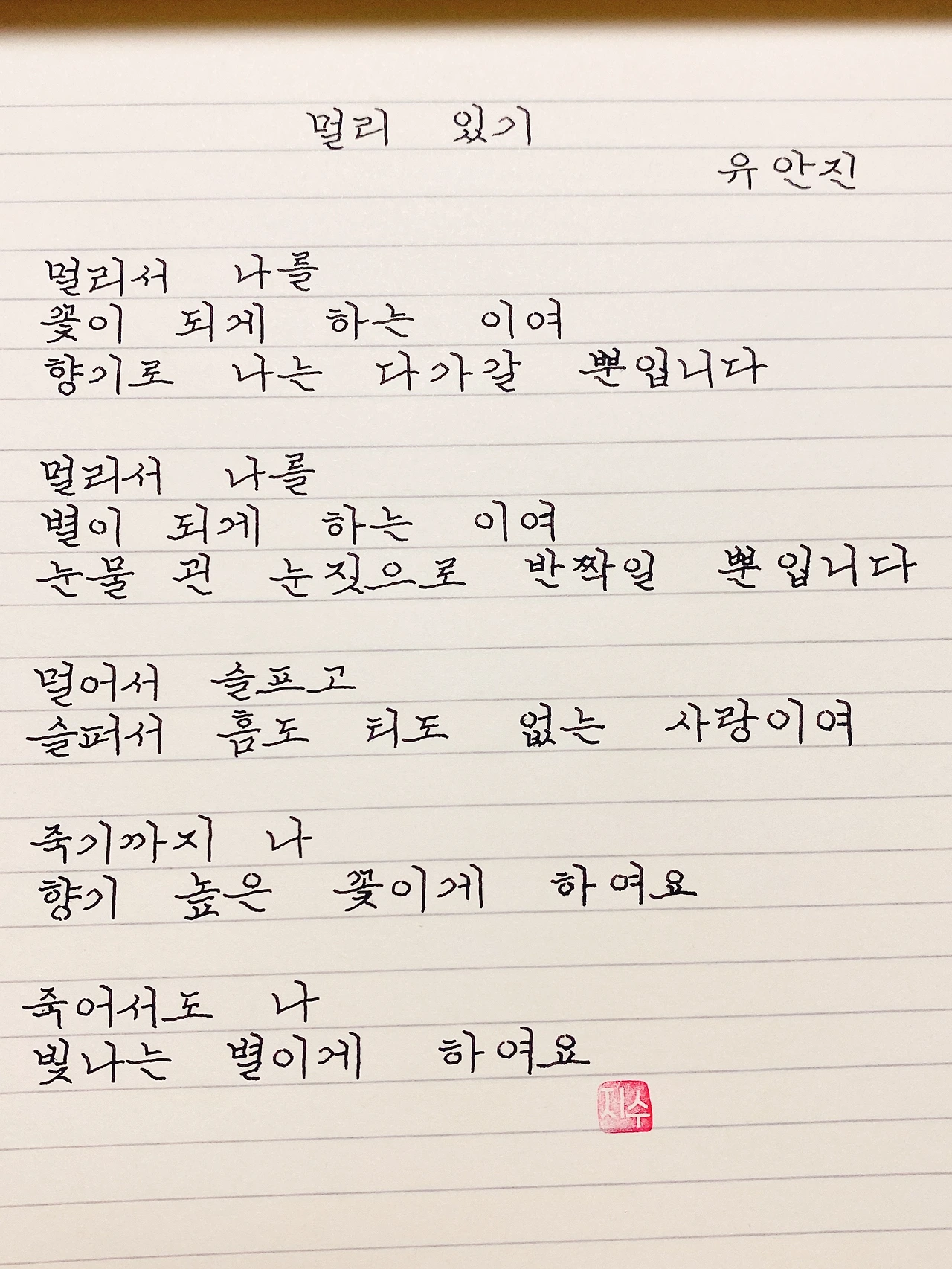 평범한 직장인. 사내 동호회를 통해 매일 한편 손으로 시 읽기를 시작한 이후로, 매일 시 한편을 필사 합니다. 필사한 시가 저작권에 문제가 된다면 말씀해주세요.