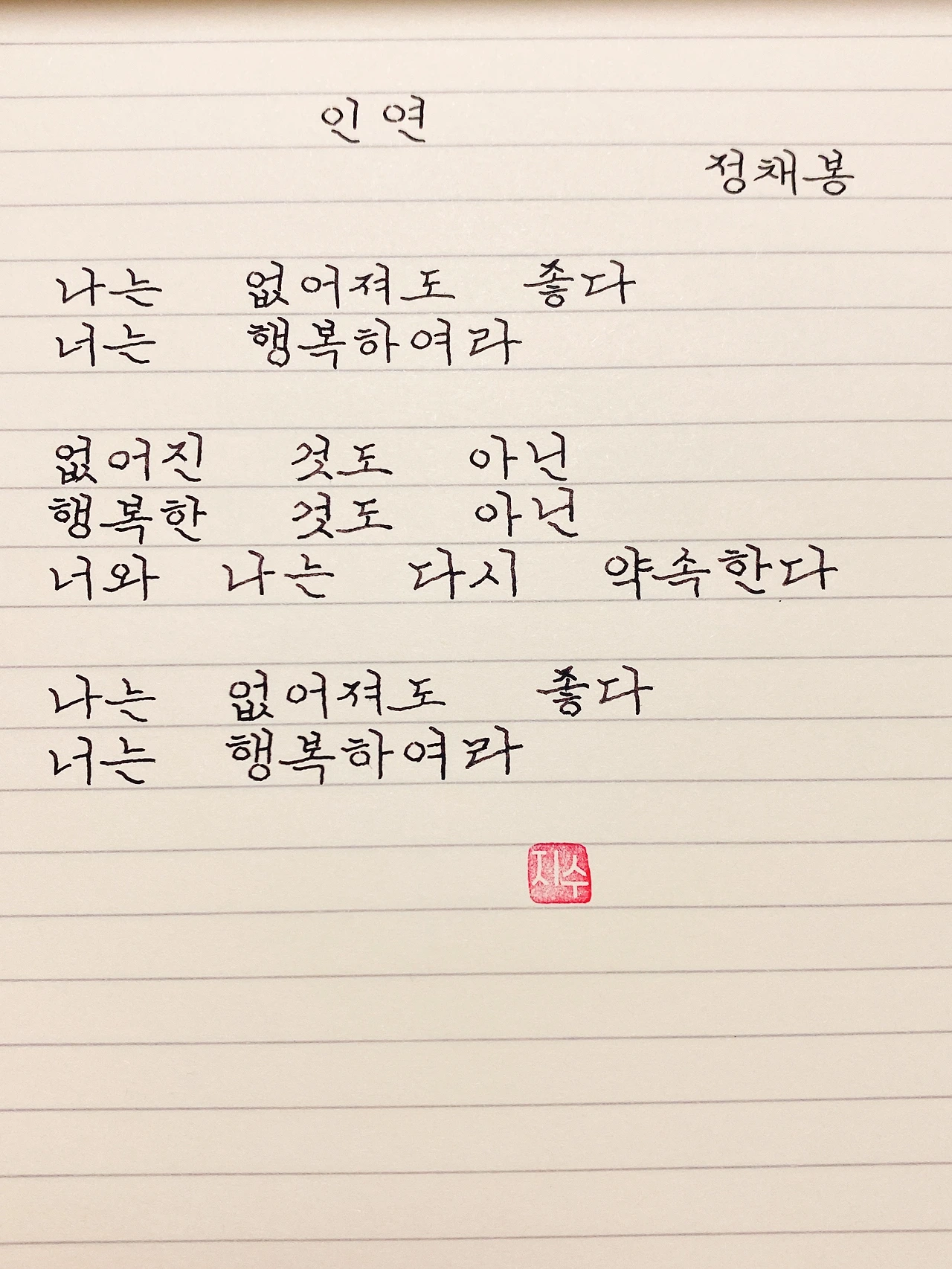평범한 직장인. 사내 동호회를 통해 매일 한편 손으로 시 읽기를 시작한 이후로, 매일 시 한편을 필사 합니다. 필사한 시가 저작권에 문제가 된다면 말씀해주세요.