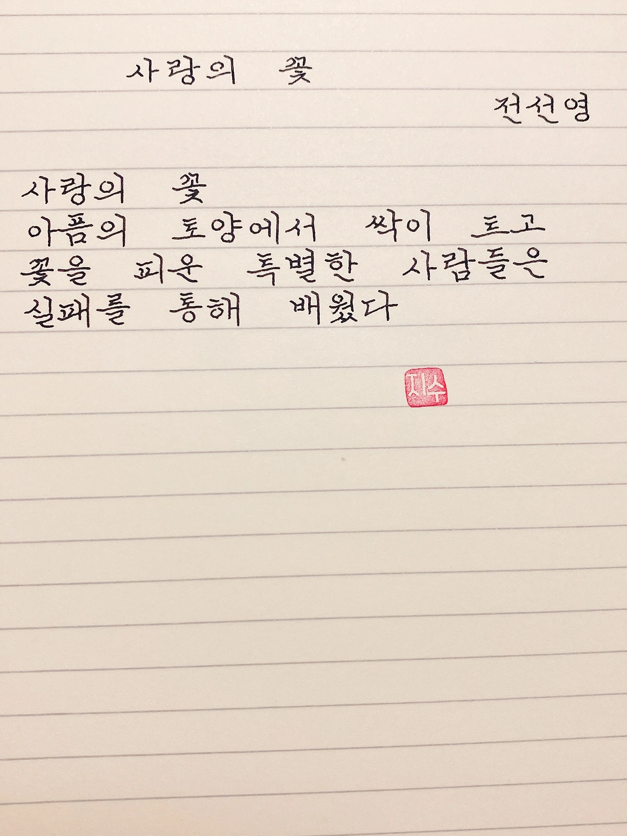 평범한 직장인. 사내 동호회를 통해 매일 한편 손으로 시 읽기를 시작한 이후로, 매일 시 한편을 필사 합니다. 필사한 시가 저작권에 문제가 된다면 말씀해주세요.