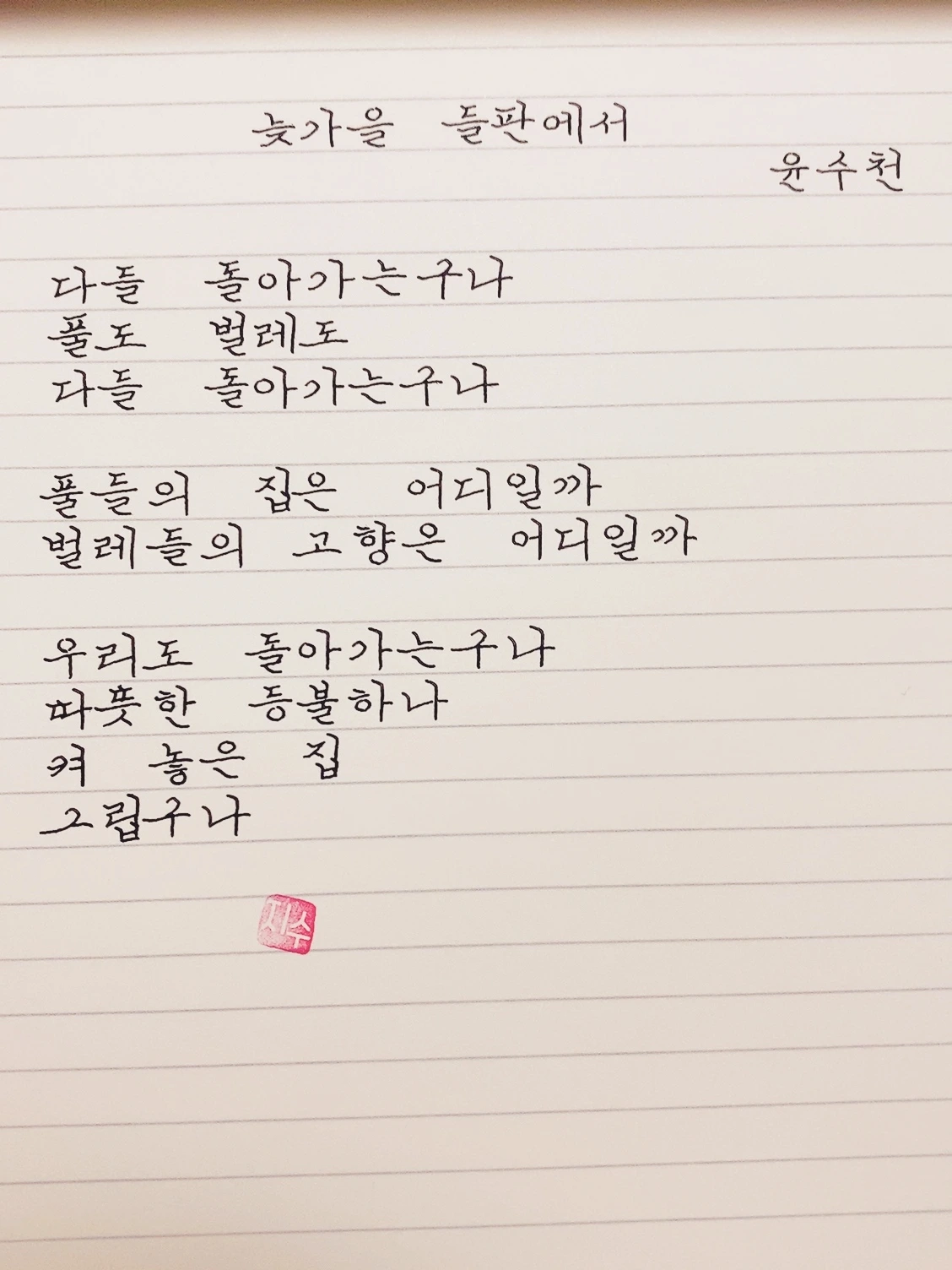 평범한 직장인. 사내 동호회를 통해 매일 한편 손으로 시 읽기를 시작한 이후로, 매일 시 한편을 필사 합니다. 필사한 시가 저작권에 문제가 된다면 말씀해주세요.