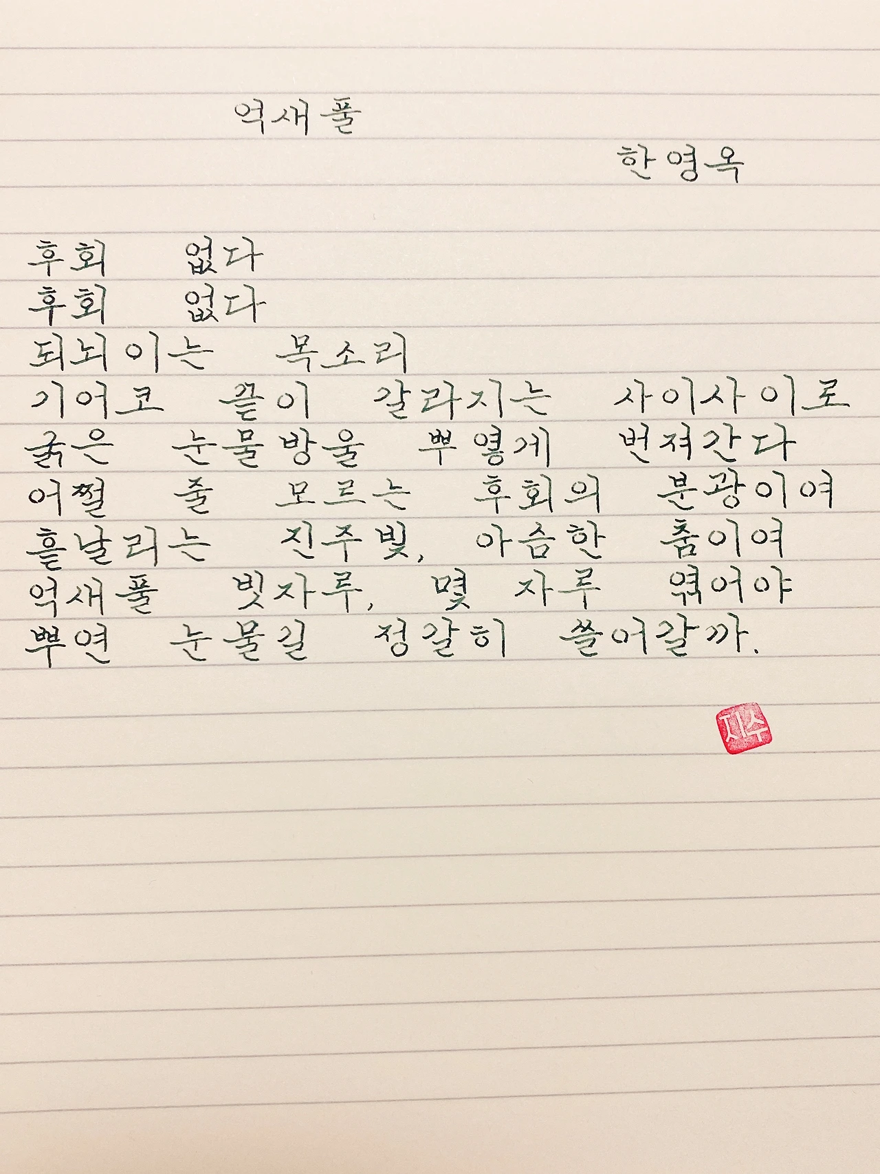 평범한 직장인. 사내 동호회를 통해 매일 한편 손으로 시 읽기를 시작한 이후로, 매일 시 한편을 필사 합니다. 필사한 시가 저작권에 문제가 된다면 말씀해주세요.