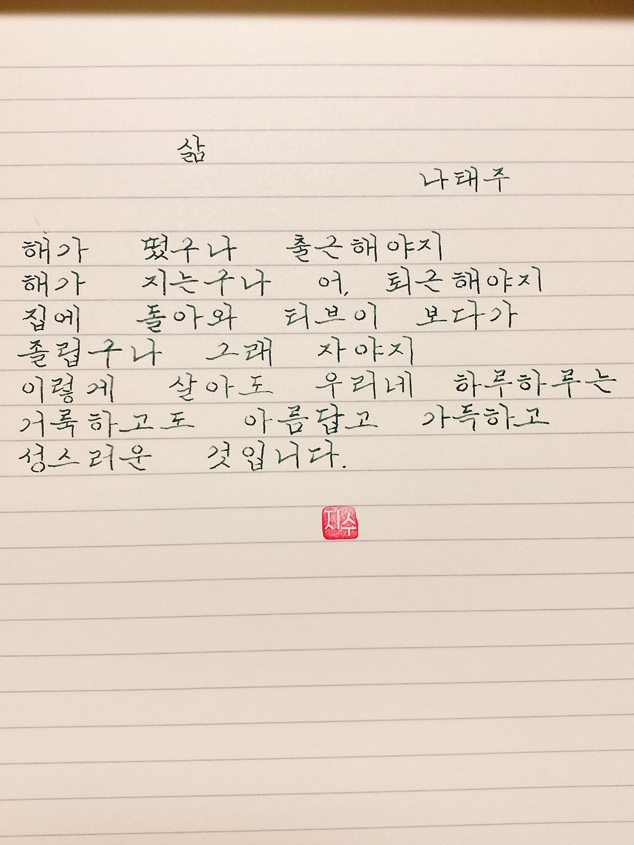 평범한 직장인. 사내 동호회를 통해 매일 한편 손으로 시 읽기를 시작한 이후로, 매일 시 한편을 필사 합니다. 필사한 시가 저작권에 문제가 된다면 말씀해주세요.