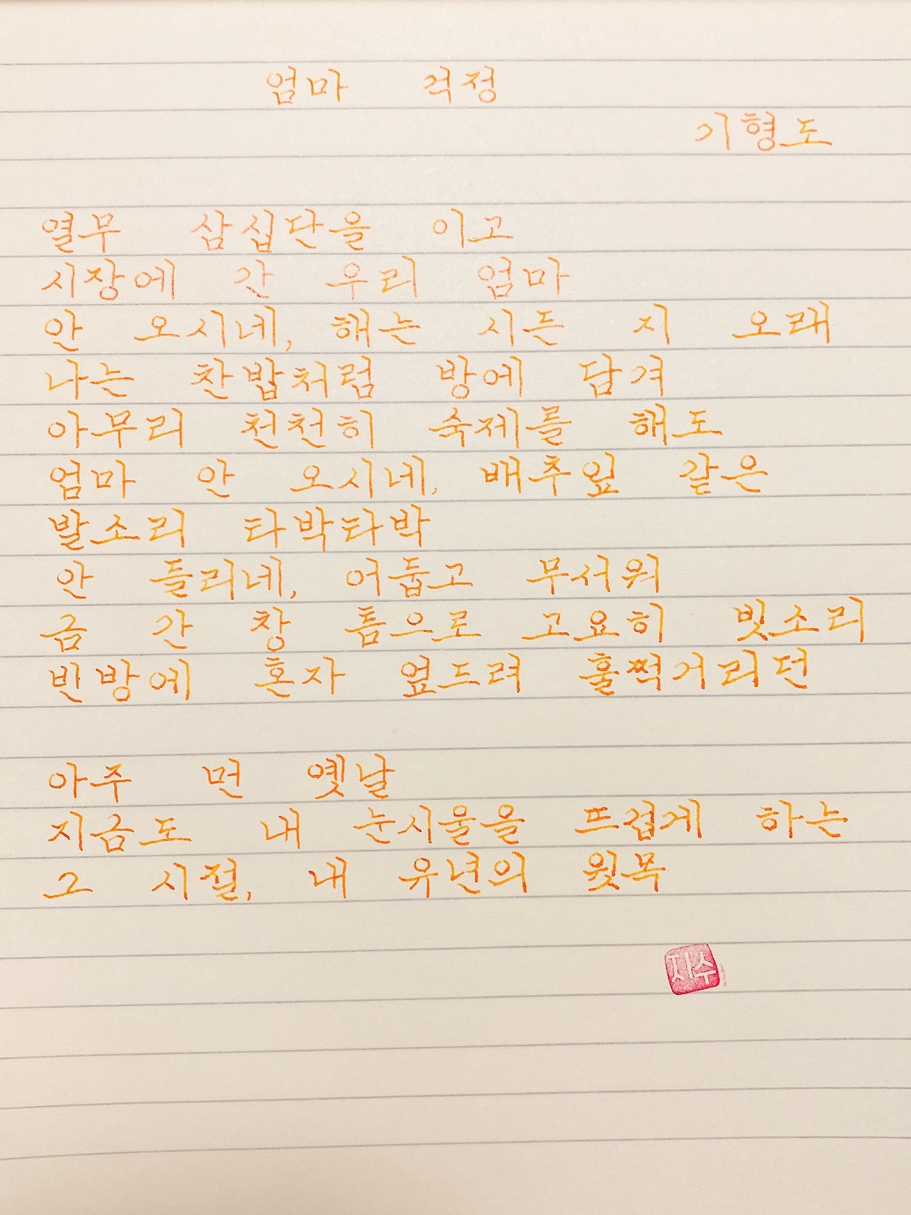 평범한 직장인. 사내 동호회를 통해 매일 한편 손으로 시 읽기를 시작한 이후로, 매일 시 한편을 필사 합니다. 필사한 시가 저작권에 문제가 된다면 말씀해주세요.