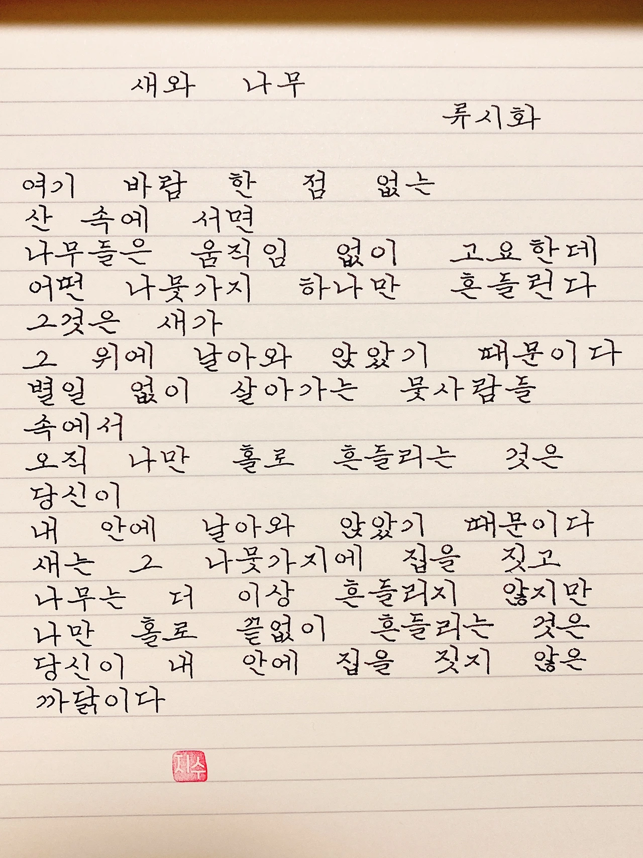 평범한 직장인. 사내 동호회를 통해 매일 한편 손으로 시 읽기를 시작한 이후로, 매일 시 한편을 필사 합니다. 필사한 시가 저작권에 문제가 된다면 말씀해주세요.