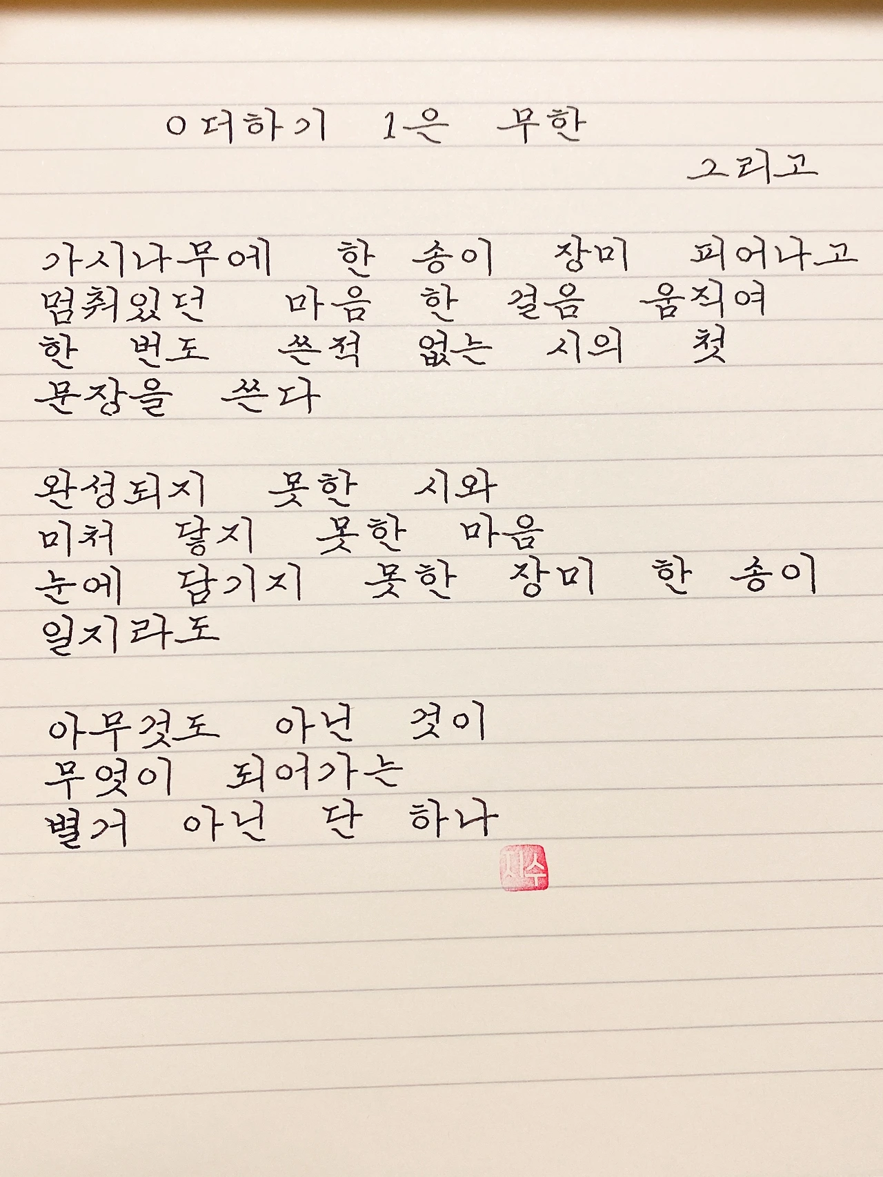 평범한 직장인. 사내 동호회를 통해 매일 한편 손으로 시 읽기를 시작한 이후로, 매일 시 한편을 필사 합니다. 필사한 시가 저작권에 문제가 된다면 말씀해주세요.