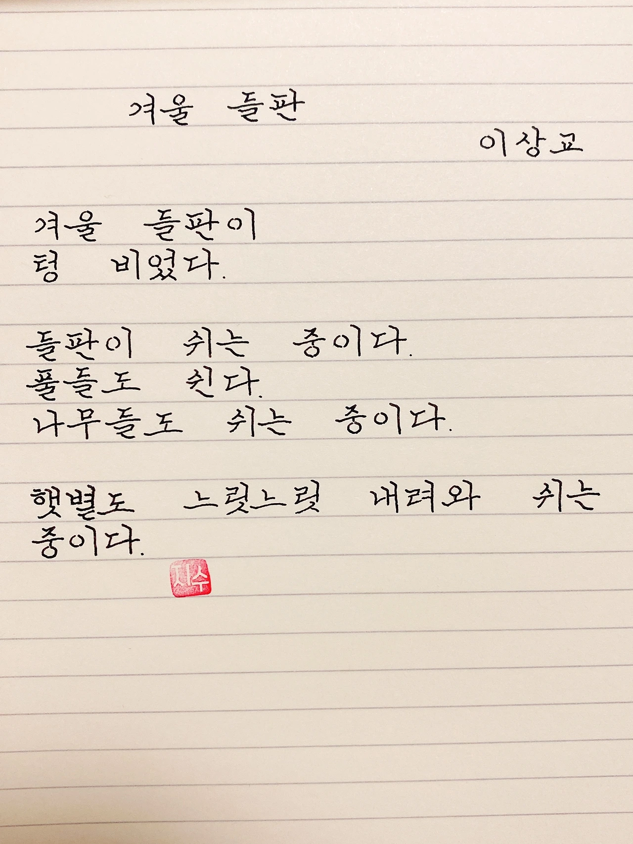 평범한 직장인. 사내 동호회를 통해 매일 한편 손으로 시 읽기를 시작한 이후로, 매일 시 한편을 필사 합니다. 필사한 시가 저작권에 문제가 된다면 말씀해주세요.