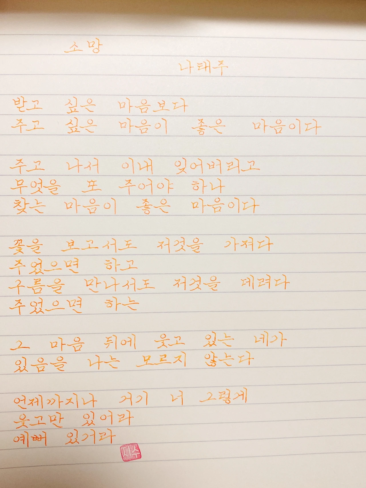 평범한 직장인. 사내 동호회를 통해 매일 한편 손으로 시 읽기를 시작한 이후로, 매일 시 한편을 필사 합니다. 필사한 시가 저작권에 문제가 된다면 말씀해주세요.