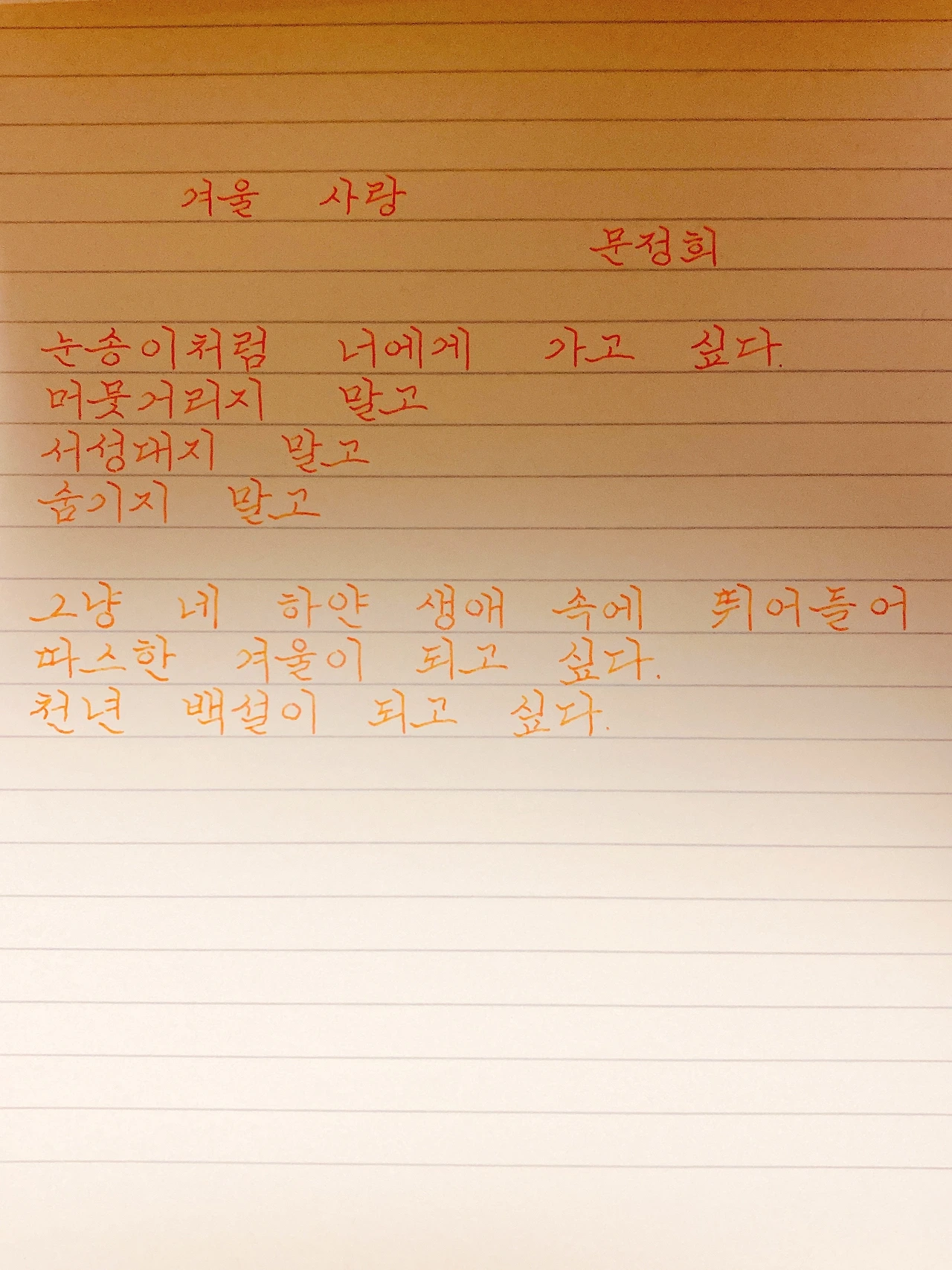 평범한 직장인. 사내 동호회를 통해 매일 한편 손으로 시 읽기를 시작한 이후로, 매일 시 한편을 필사 합니다. 필사한 시가 저작권에 문제가 된다면 말씀해주세요.