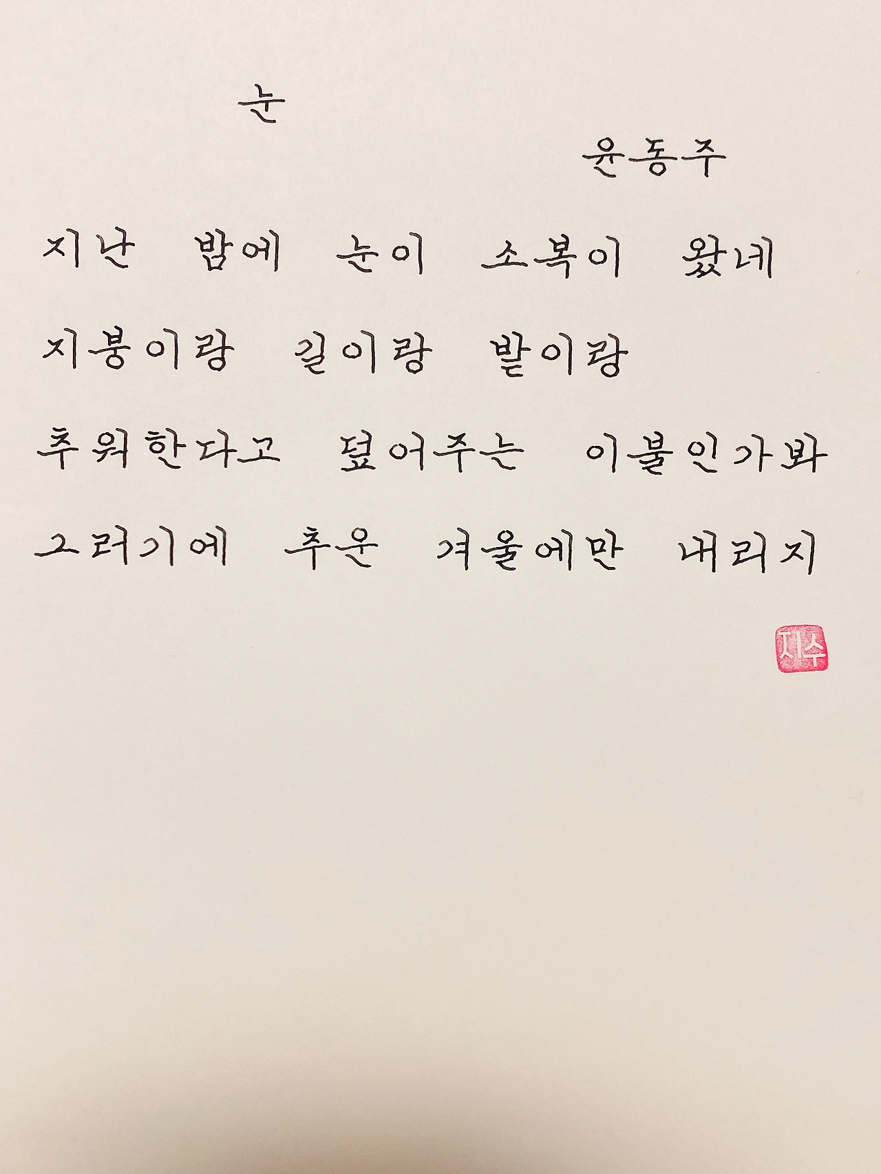 평범한 직장인. 사내 동호회를 통해 매일 한편 손으로 시 읽기를 시작한 이후로, 매일 시 한편을 필사 합니다. 필사한 시가 저작권에 문제가 된다면 말씀해주세요.