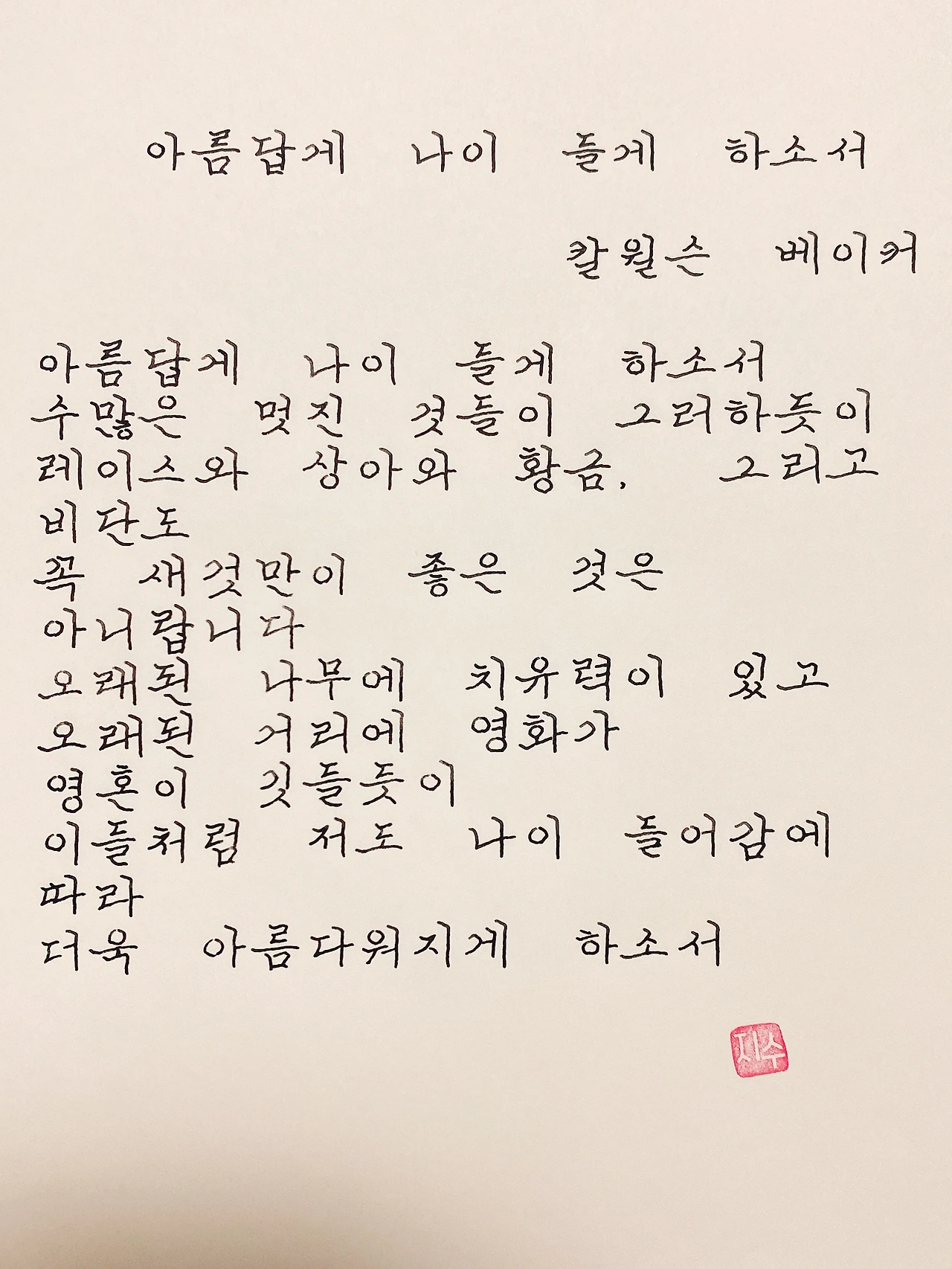 평범한 직장인. 사내 동호회를 통해 매일 한편 손으로 시 읽기를 시작한 이후로, 매일 시 한편을 필사 합니다. 필사한 시가 저작권에 문제가 된다면 말씀해주세요.