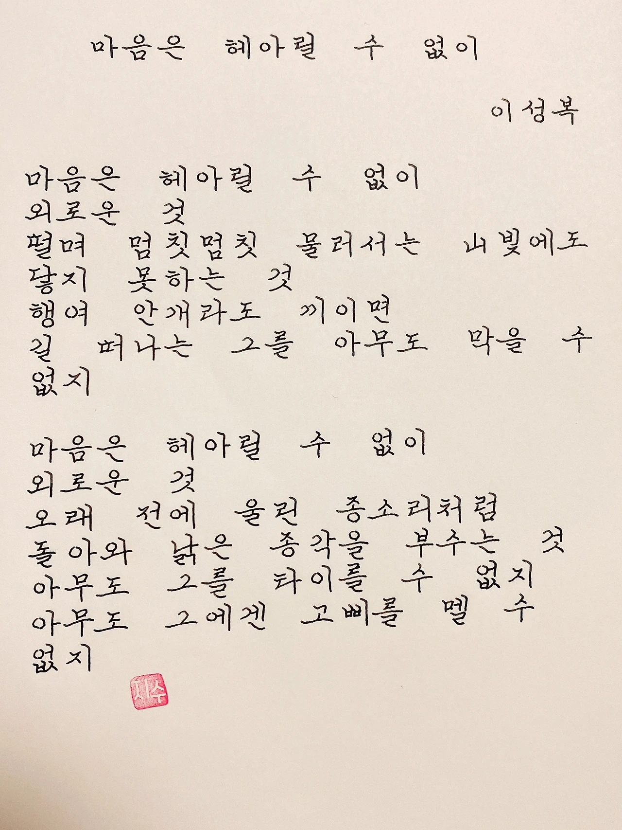 평범한 직장인. 사내 동호회를 통해 매일 한편 손으로 시 읽기를 시작한 이후로, 매일 시 한편을 필사 합니다. 필사한 시가 저작권에 문제가 된다면 말씀해주세요.