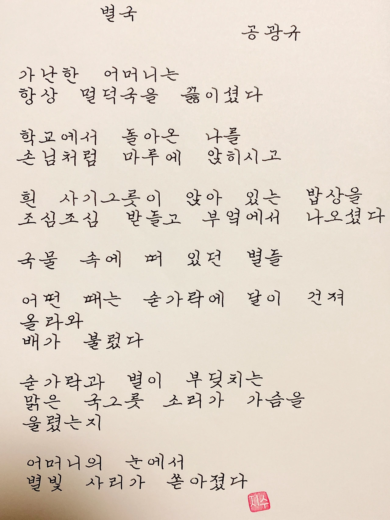 평범한 직장인. 사내 동호회를 통해 매일 한편 손으로 시 읽기를 시작한 이후로, 매일 시 한편을 필사 합니다. 필사한 시가 저작권에 문제가 된다면 말씀해주세요.