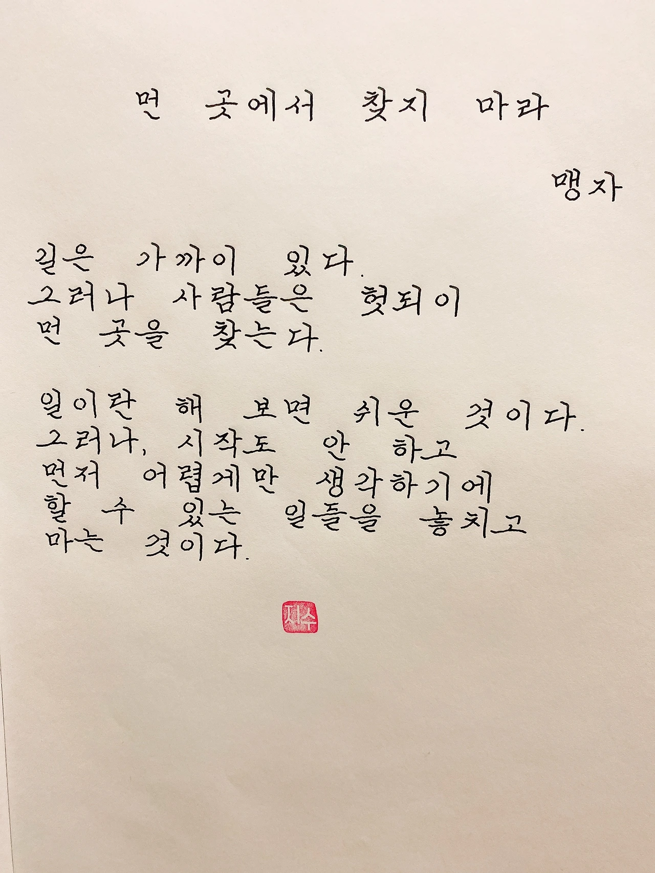 평범한 직장인. 사내 동호회를 통해 매일 한편 손으로 시 읽기를 시작한 이후로, 매일 시 한편을 필사 합니다. 필사한 시가 저작권에 문제가 된다면 말씀해주세요.