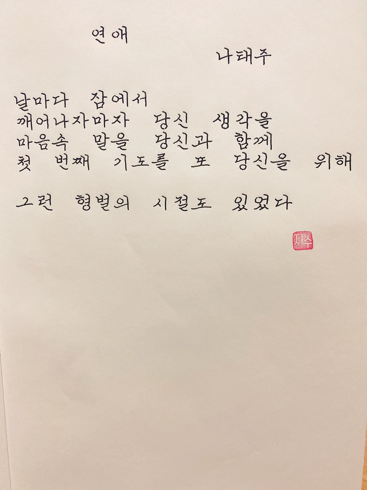 평범한 직장인. 사내 동호회를 통해 매일 한편 손으로 시 읽기를 시작한 이후로, 매일 시 한편을 필사 합니다. 필사한 시가 저작권에 문제가 된다면 말씀해주세요.