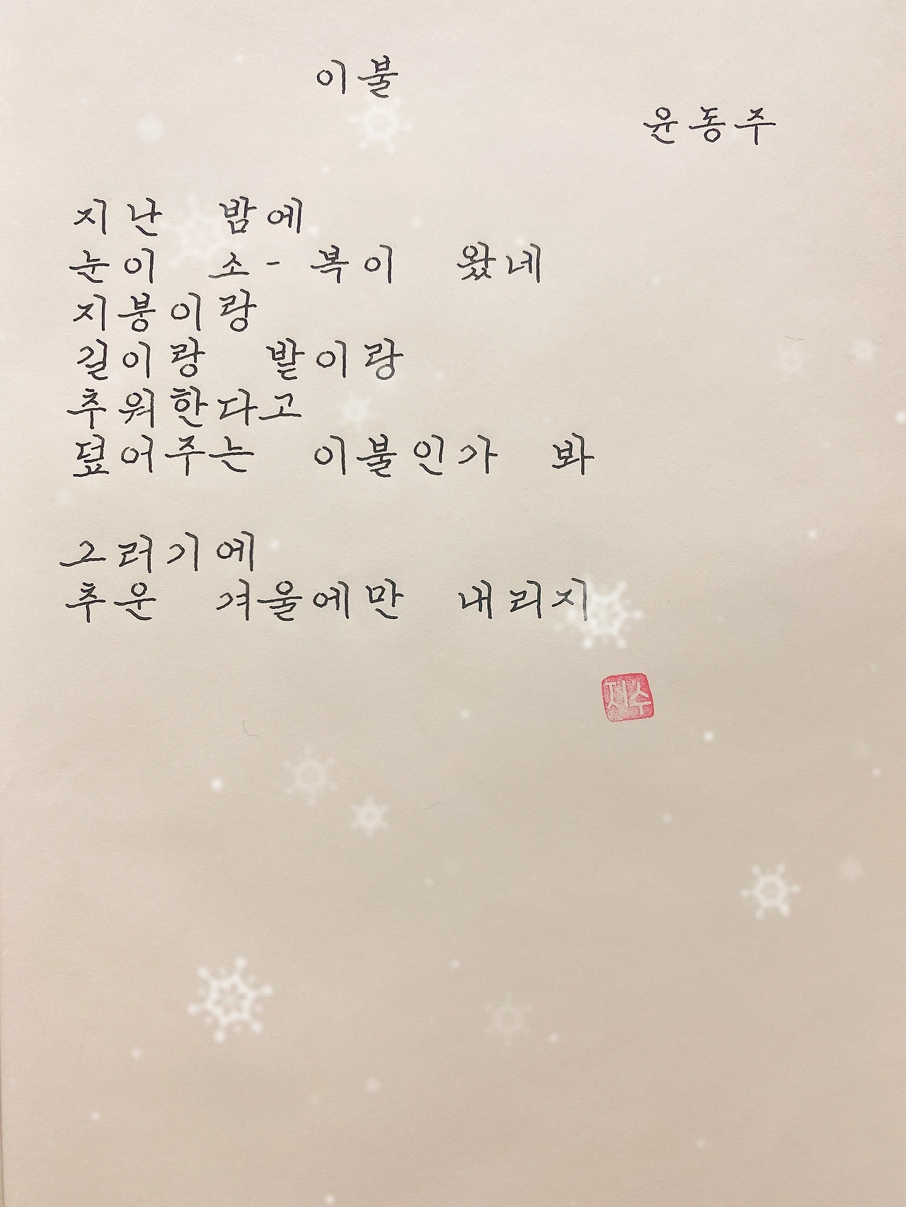 평범한 직장인. 사내 동호회를 통해 매일 한편 손으로 시 읽기를 시작한 이후로, 매일 시 한편을 필사 합니다. 필사한 시가 저작권에 문제가 된다면 말씀해주세요.