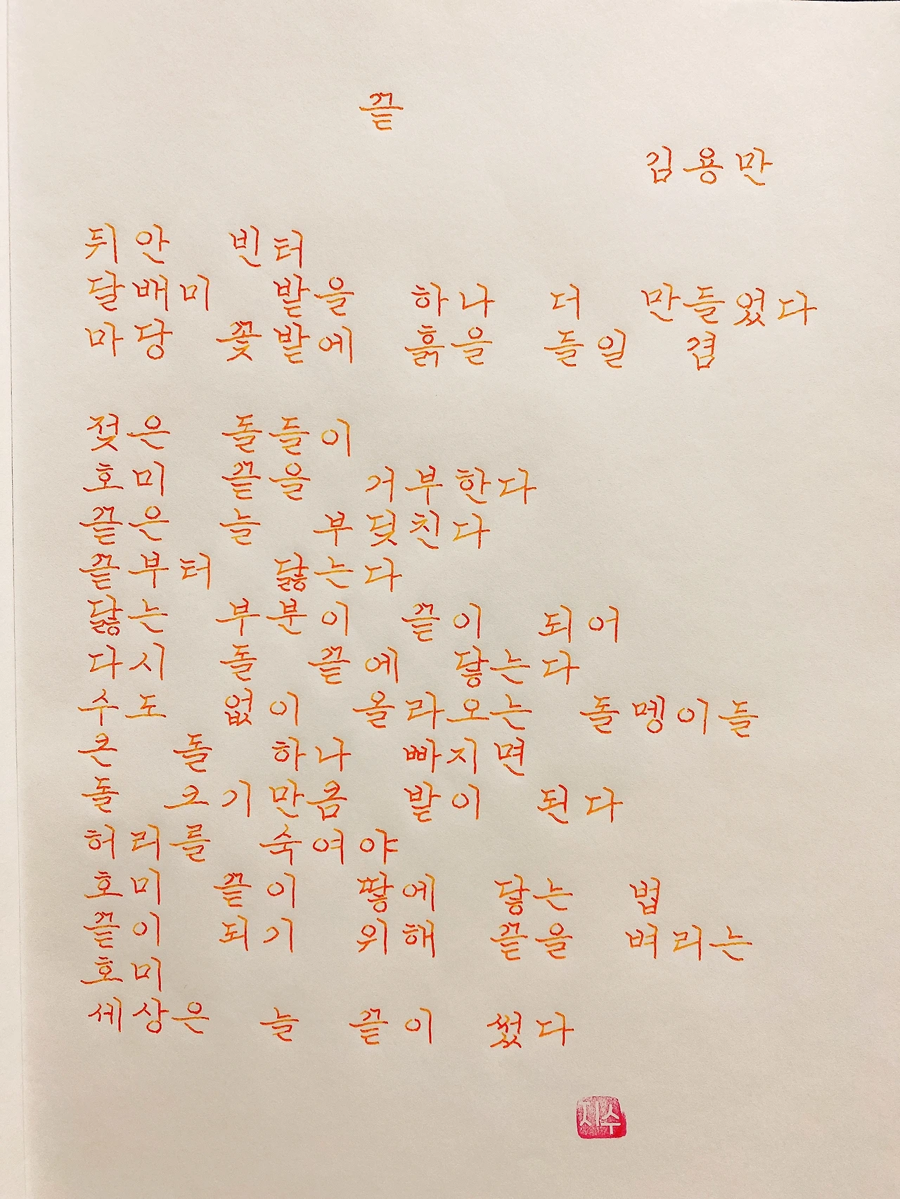 평범한 직장인. 사내 동호회를 통해 매일 한편 손으로 시 읽기를 시작한 이후로, 매일 시 한편을 필사 합니다. 필사한 시가 저작권에 문제가 된다면 말씀해주세요.